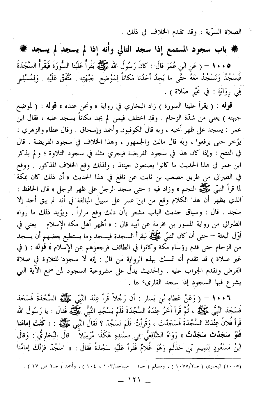 1005 - (عَنْ ابْنِ عُمَرَ قَالَ: «كَانَ رَسُولُ اللَّهِ - صَلَّى اللَّهُ عَلَيْهِ وَسَلَّمَ - يَقْرَأُ عَلَيْنَا السُّورَةَ فَيَقْرَأُ السَّجْدَةَ فَيَسْجُدُ وَنَسْجُدُ مَعَهُ حَتَّى مَا يَجِدُ أَحَدُنَا مَكَانًا لِمَوْضِعِ جَبْهَتِهِ» . مُتَّفَقٌ عَلَيْهِ وَلِمُسْلِمٍ فِي رِوَايَةٍ فِي غَيْرِ صَلَاةٍ)