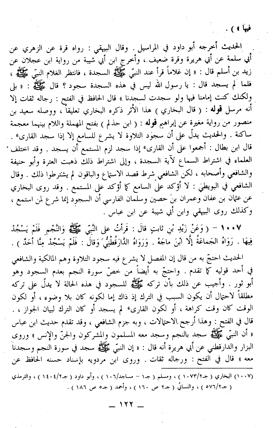 وَأَخْرَجَ ابْنُ أَبِي شَيْبَةَ مِنْ رِوَايَةِ ابْنِ عَجْلَانَ عَنْ زَيْدِ بْنِ أَسْلَمَ قَالَ: «إنَّ غُلَامًا قَرَأَ عِنْدَ النَّبِيِّ - صَلَّى اللَّهُ عَلَيْهِ وَسَلَّمَ - السَّجْدَةَ، فَانْتَظَرَ الْغُلَامُ النَّبِيَّ - صَلَّى اللَّهُ عَلَيْهِ وَسَلَّمَ -، فَلَمَّا لَمْ يَسْجُدْ قَالَ: يَا رَسُولَ اللَّهِ لَيْسَ فِي هَذِهِ السَّجْدَةِ سُجُودٌ؟ قَالَ - صَلَّى اللَّهُ عَلَيْهِ وَسَلَّمَ -: بَلَى وَلَكِنَّك كُنْتَ إمَامَنَا فِيهَا وَلَوْ سَجَدْتَ لَسَجَدْنَا» قَالَ الْحَافِظُ فِي الْفَتْحِ: رِجَالُهُ ثِقَاتٌ إلَّا أَنَّهُ مُرْسَلٌ قَوْلُهُ: الْبُخَارِيُّ هَذَا الْأَثَرُ ذَكَرَهُ الْبُخَارِيّ تَعْلِيقًا، وَوَصَلَهُ سَعِيدُ بْنُ مَنْصُورٍ مِنْ رِوَايَةِ مُغِيرَةَ عَنْ إبْرَاهِيمَ قَوْله: (ابْن حَذْلَمَ) بِفَتْحِ الْمُهْمَلَةِ وَاللَّامِ بَيْنَهُمَا مُعْجَمَةٌ سَاكِنَةٌ.