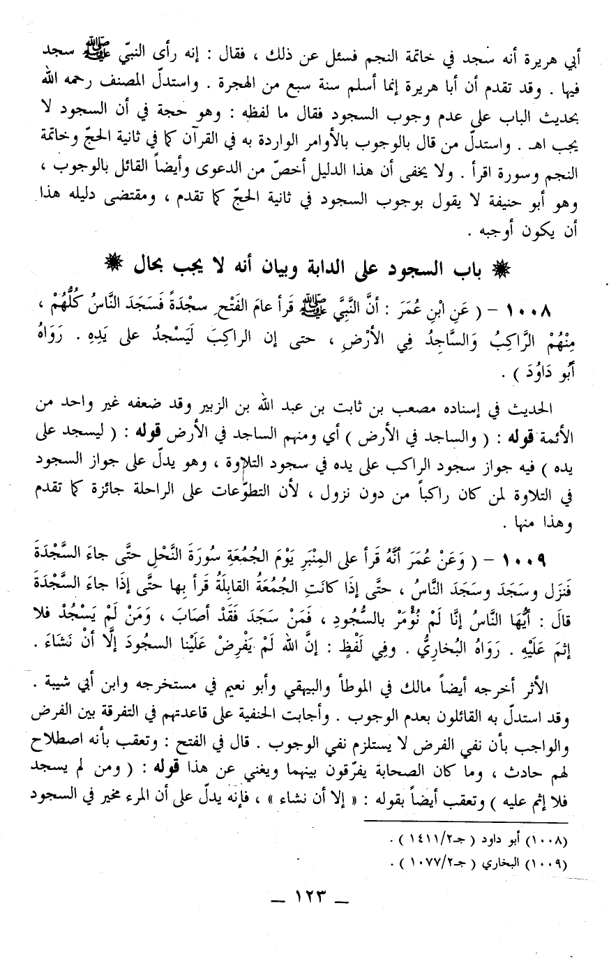 1008 - (عَنْ ابْنِ عُمَرَ «أَنَّ النَّبِيَّ - صَلَّى اللَّهُ عَلَيْهِ وَسَلَّمَ - قَرَأَ عَامَ الْفَتْحِ سَجْدَةً فَسَجَدَ النَّاسُ كُلُّهُمْ مِنْهُمْ الرَّاكِبُ وَالسَّاجِدُ فِي الْأَرْضِ، حَتَّى إنَّ الرَّاكِبَ لَيَسْجُدُ عَلَى يَدِهِ» . رَوَاهُ أَبُو دَاوُد) .