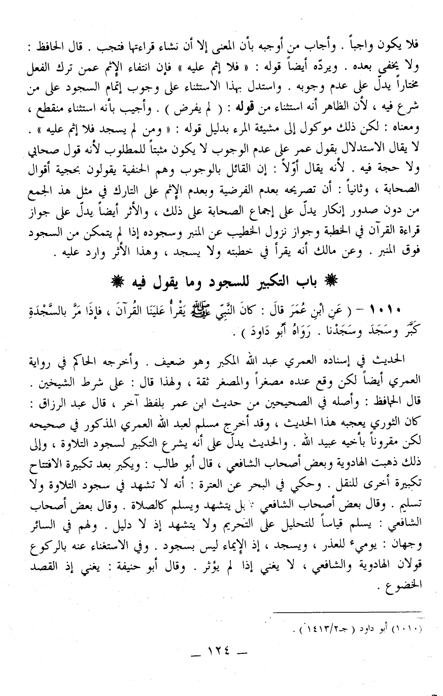 1010 - (عَنْ ابْنِ عُمَرَ قَالَ: «كَانَ النَّبِيُّ - صَلَّى اللَّهُ عَلَيْهِ وَسَلَّمَ - يَقْرَأُ عَلَيْنَا الْقُرْآنَ، فَإِذَا مَرَّ بِالسَّجْدَةِ كَبَّرَ وَسَجَدَ وَسَجَدْنَا» . رَوَاهُ أَبُو دَاوُد) .