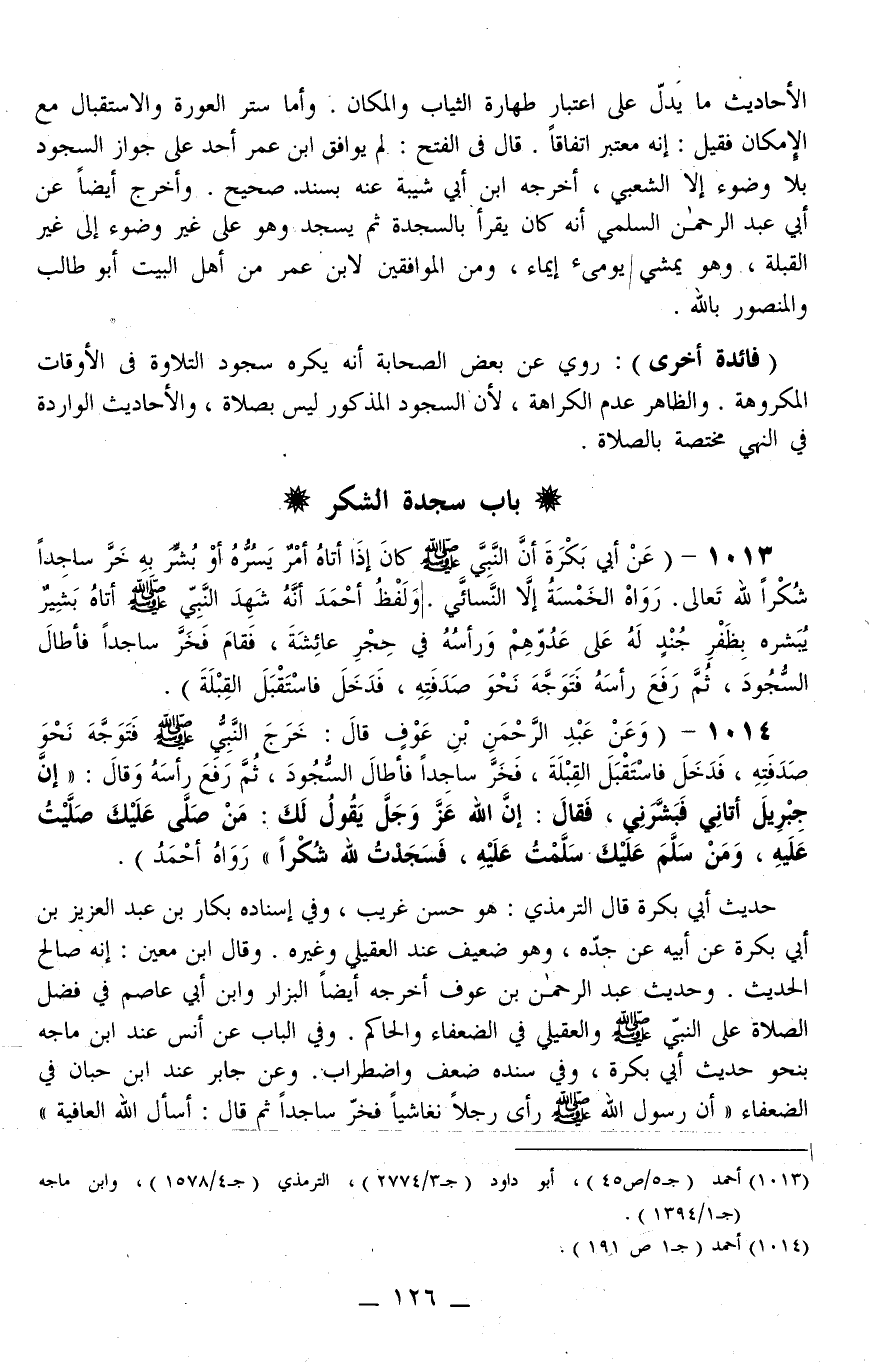 1013 - (عَنْ أَبِي بَكْرَةَ «أَنَّ النَّبِيَّ - صَلَّى اللَّهُ عَلَيْهِ وَسَلَّمَ - كَانَ إذَا أَتَاهُ أَمْرٌ يَسُرُّهُ أَوْ بُشِّرَ بِهِ خَرَّ سَاجِدًا: شُكْرًا لِلَّهِ تَعَالَى» . رَوَاهُ الْخَمْسَةُ إلَّا النَّسَائِيّ.