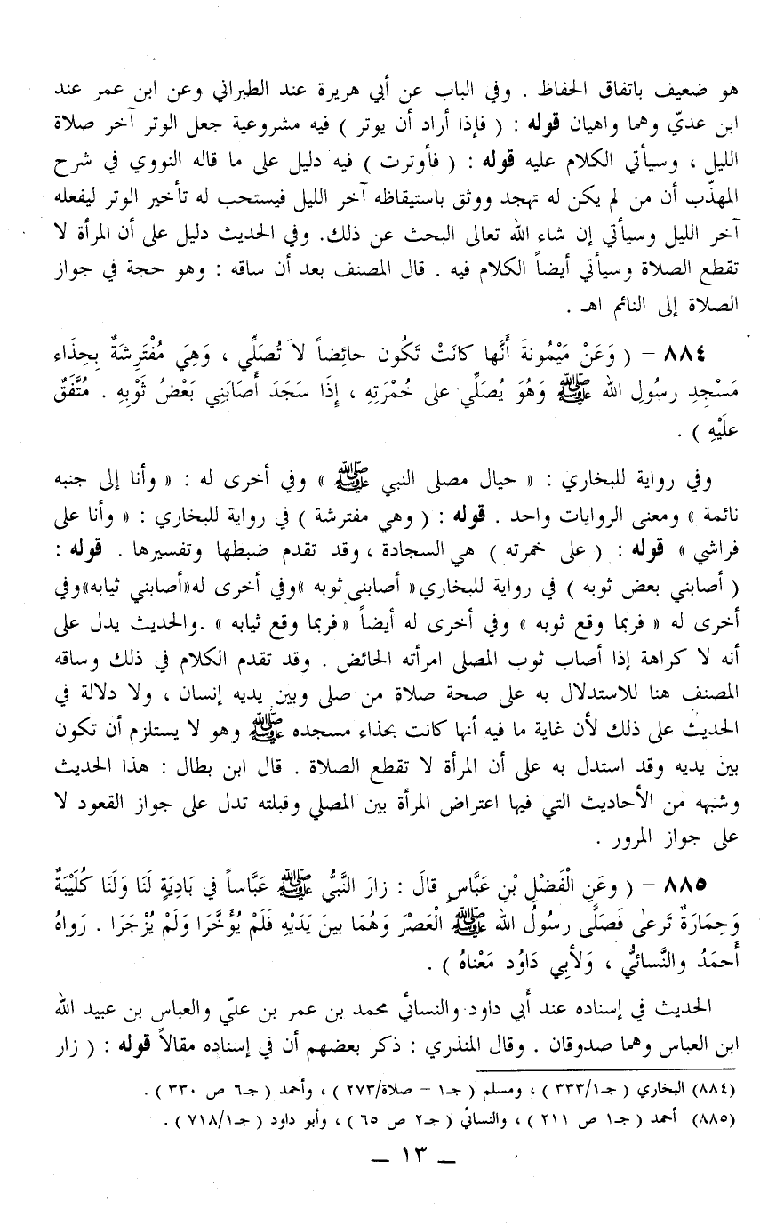 885 - (وَعَنْ الْفَضْلِ بْنِ عَبَّاسٍ قَالَ: «زَارَ النَّبِيُّ - صَلَّى اللَّهُ عَلَيْهِ وَسَلَّمَ - عَبَّاسًا فِي بَادِيَةٍ لَنَا وَلَنَا كُلَيْبَةٌ وَحِمَارَةٌ تَرْعَى فَصَلَّى رَسُولُ اللَّه - صَلَّى اللَّهُ عَلَيْهِ وَسَلَّمَ - الْعَصْرَ وَهُمَا بَيْنَ يَدَيْهِ فَلَمْ يُؤَخَّرَا وَلَمْ يُزْجَرَا.» رَوَاهُ أَحْمَدُ وَالنَّسَائِيُّ، وَلِأَبِي دَاوُد مَعْنَاهُ) .