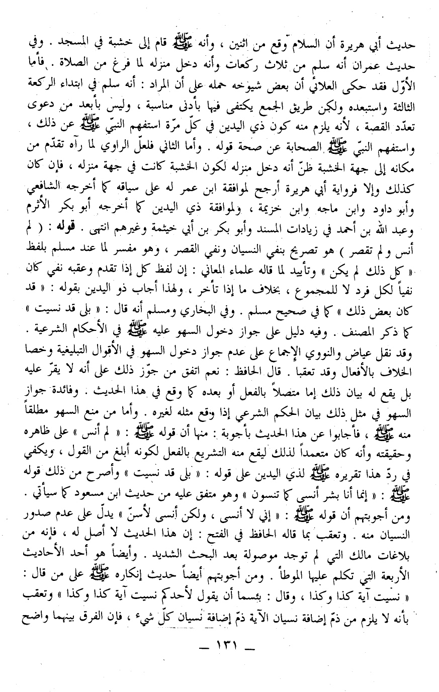 وَأَمَّا مَنْ مَنَعَ السَّهْوَ مُطْلَقًا مِنْهُ - صَلَّى اللَّهُ عَلَيْهِ وَسَلَّمَ - فَأَجَابُوا عَنْ هَذَا الْحَدِيثَ بِأَجْوِبَةٍ: مِنْهَا أَنَّ قَوْلَهُ - صَلَّى اللَّهُ عَلَيْهِ وَسَلَّمَ -: " لَمْ أَنْسَ " عَلَى ظَاهِرِهِ وَحَقِيقَتُهُ وَأَنَّهُ كَانَ مُتَعَمِّدًا لِذَلِكَ لِيَقَع مِنْهُ التَّشْرِيعُ بِالْفِعْلِ أَبْلَغَ مِنْ الْقَوْلِ، وَيَكْفِي فِي رَدِّ هَذَا تَقْرِيرُهُ - صَلَّى اللَّهُ عَلَيْهِ وَسَلَّمَ - لِذِي الْيَدَيْنِ عَلَى قَوْلِهِ: " بَلَى قَدْ نَسِيت " وَأَصْرَحُ مِنْ ذَلِكَ قَوْلُهُ - صَلَّى اللَّهُ عَلَيْهِ وَسَلَّمَ -: «إنَّمَا أَنَا بَشَرٌ أَنْسَى كَمَا تَنْسَوْنَ» وَهُوَ مُتَّفَقٌ عَلَيْهِ مِنْ حَدِيثِ ابْنِ مَسْعُودٍ كَمَا سَيَأْتِي.