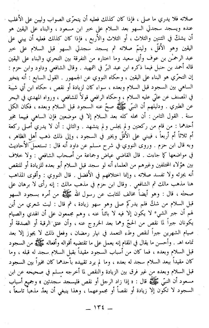 وَأَحْسَنُ مَا يُقَالُ فِي الْمَقَامِ إنَّهُ يَعْمَل عَلَى مَا تَقْتَضِيهِ أَقْوَالُهُ وَأَفْعَالُهُ - صَلَّى اللَّهُ عَلَيْهِ وَسَلَّمَ - مِنْ السُّجُودِ قَبْلِ السَّلَامِ وَبَعْدَهُ، فَمَا كَانَ مِنْ أَسْبَابِ السُّجُودِ مُقَيَّدًا بِقَبْلِ السَّلَام سَجَدَ لَهُ قَبْلَهُ، وَمَا كَانَ مُقَيَّدًا بِبَعْدِ السَّلَامِ سَجَدَ لَهُ بَعْدَهُ، وَمَا لَمْ يَرِدْ تَقْيِيدُهُ بِأَحَدِهِمَا كَانَ مُخَيَّرًا بَيْنَ السُّجُودِ قَبْلَ السَّلَامِ وَبَعْدَهُ مِنْ غَيْرِ فَرْقٍ بَيْنَ الزِّيَادَةِ وَالنَّقْصِ لِمَا أَخْرَجَهُ مُسْلِمٌ فِي صَحِيحِهِ عَنغ ابْنِ مَسْعُودٍ أَنَّ النَّبِيَّ - صَلَّى اللَّهُ عَلَيْهِ وَسَلَّمَ - قَالَ: «إذَا زَادَ الرَّجُلُ أَوْ نَقَصَ فَلْيَسْجُدْ سَجْدَتَيْنِ» وَجَمِيعُ أَسْبَابِ السُّجُودِ لَا تَكُونُ إلَّا زِيَادَةً أَوْ نَقْصًا أَوْ مَجْمُوعَهُمَا، وَهَذَا يَنْبَغِي أَنْ يُعَدَّ مَذْهَبًا تَاسِعًا،