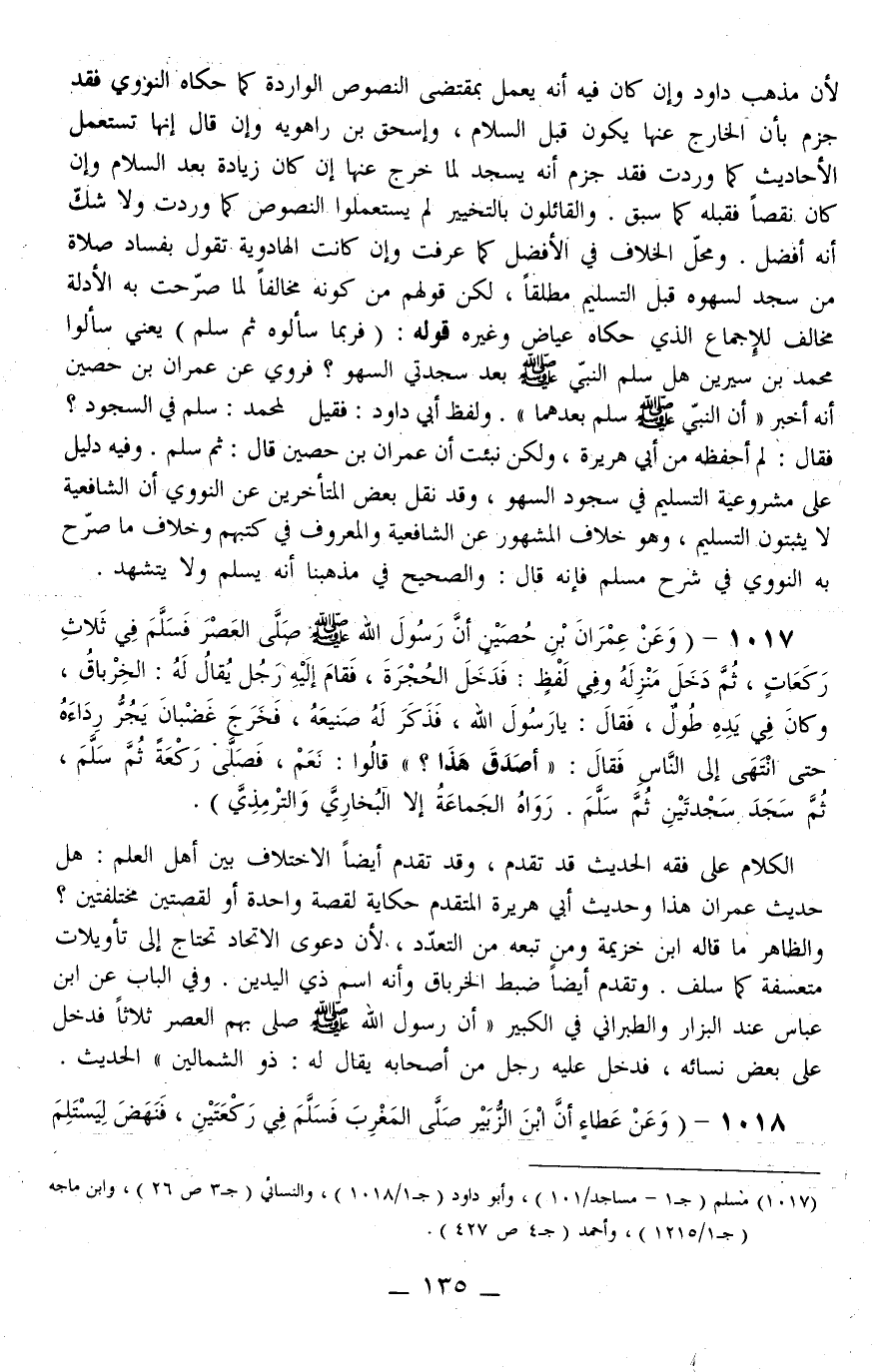 1017 - (وَعَنْ عِمْرَانَ بْنِ حُصَيْنٍ «أَنَّ رَسُولَ اللَّهِ - صَلَّى اللَّهُ عَلَيْهِ وَسَلَّمَ - صَلَّى الْعَصْرَ فَسَلَّمَ فِي ثَلَاثِ رَكَعَاتٍ، ثُمَّ دَخَلَ مَنْزِلَهُ وَفِي لَفْظٍ: فَدَخَلَ الْحُجْرَةَ، فَقَامَ إلَيْهِ رَجُلٌ يُقَال لَهُ: الْخِرْبَاقُ، وَكَانَ فِي يَدِهِ طُولٌ، فَقَالَ يَا رَسُولَ اللَّهِ، فَذَكَر لَهُ صَنِيعَهُ، فَخَرَجَ غَضْبَانَ يَجُرُّ رِدَاءَهُ حَتَّى انْتَهَى إلَى النَّاسِ فَقَالَ: أَصَدَقَ هَذَا؟ قَالُوا: نَعَمْ، فَصَلَّى رَكْعَةً ثُمَّ سَلَّمَ، ثُمَّ سَجَدَ سَجْدَتَيْنِ ثُمَّ سَلَّمَ» . رَوَاهُ الْجَمَاعَةُ إلَّا الْبُخَارِيَّ وَالتِّرْمِذِيَّ) . الْكَلَام عَلَى فِقْهِ الْحَدِيثِ قَدْ تَقَدَّمَ، وَقَدْ تَقَدَّمَ أَيْضًا الِاخْتِلَافُ بَيْنَ أَهْلِ الْعِلْمِ: هَلْ حَدِيثُ عِمْرَانَ هَذَا وَحَدِيثُ أَبِي هُرَيْرَةَ الْمُتَقَدِّم حِكَايَةٌ لِقِصَّةٍ وَاحِدَةٍ أَوْ لِقِصَّتَيْنِ مُخْتَلِفَتَيْنِ؟ وَالظَّاهِرُ مَا قَالَهُ خُزَيْمَةَ وَمَنْ تَبِعَهُ مِنْ التَّعَدُّدِ، دَعْوَى الِاتِّحَادِ تَحْتَاجُ إلَى تَأْوِيلَاتٍ مُتَعَسِّفَةٍ كَمَا سَلَفَ. وَتَقَدَّمَ أَيْضًا ضَبْطُ الْخِرْبَاقِ وَأَنَّهُ اسْمُ ذِي الْيَدَيْنِ.