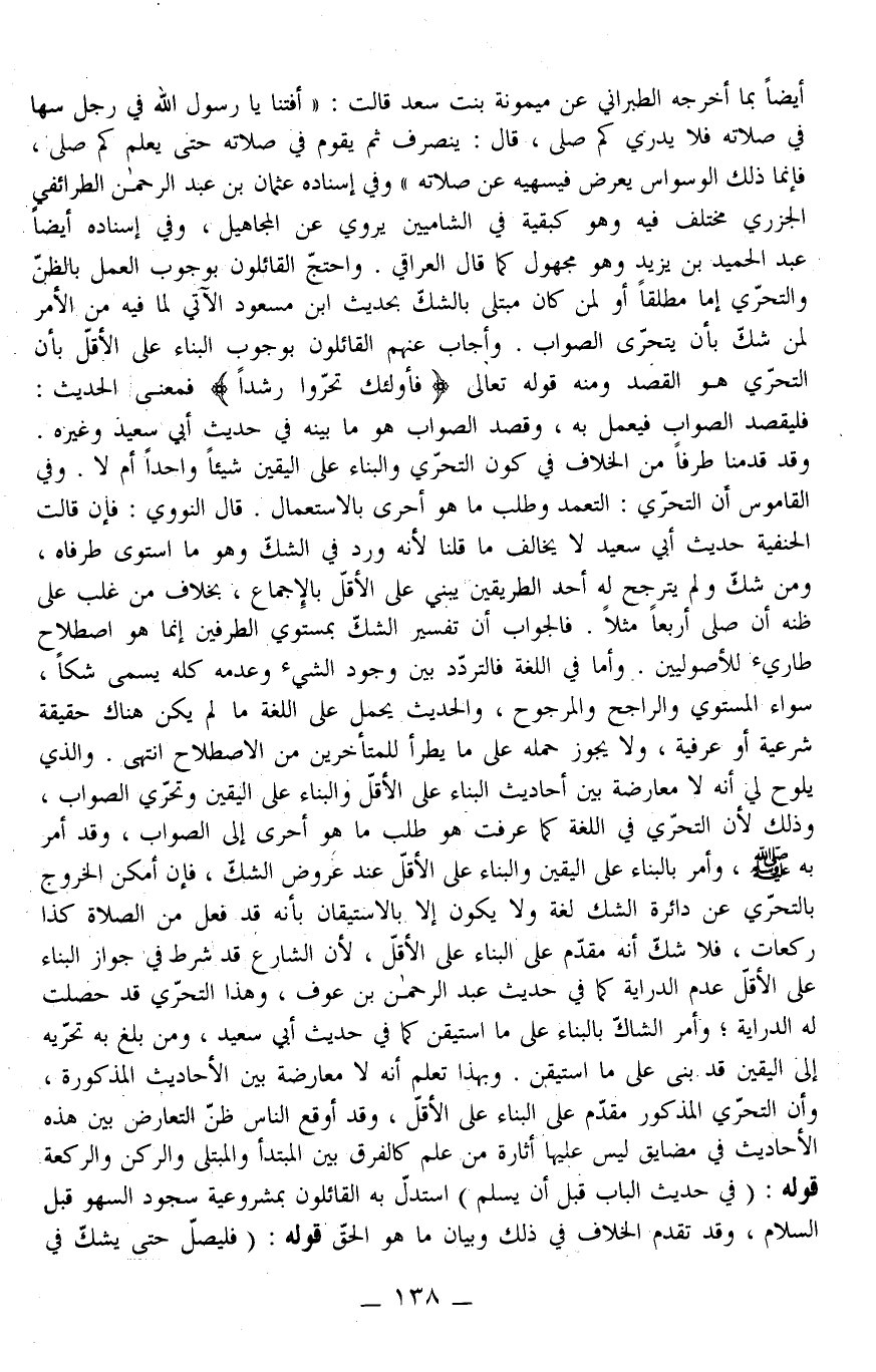 وَاحْتَجَّ الْقَائِلُونَ بِوُجُوبِ الْعَمَلِ بِالظَّنِّ وَالتَّحَرِّي إمَّا مُطْلَقًا أَوْ لِمَنْ كَانَ مُبْتَلًى بِالشَّكِّ بِحَدِيثِ ابْنِ مَسْعُودٍ الْآتِي لِمَا فِيهِ مِنْ الْأَمْرِ لِمَنْ شَكَّ بِأَنْ يَتَحَرَّى الصَّوَابَ. وَأَجَابَ عَنْهُمْ الْقَائِلُونَ بِوُجُوبِ الْبِنَاءِ عَلَى الْأَقَلِّ بِأَنَّ التَّحَرِّيَ هُوَ الْقَصْدُ وَمِنْهُ قَوْله تَعَالَى {فَأُولَئِكَ تَحَرَّوْا رَشَدًا} [الجن: 14] فَمَعْنَى الْحَدِيثِ: فَلْيَقْصِدْ الصَّوَابَ فَيَعْمَلُ بِهِ، وَقَصْدُ الصَّوَابَ هُوَ مَا بَيَّنَهُ فِي حَدِيثِ أَبِي سَعِيدٍ وَغَيْرِهِ. وَقَدْ قَدَّمْنَا طَرَفًا مِنْ الْخِلَافِ فِي كَوْنِ التَّحَرِّي وَالْبِنَاءِ عَلَى الْيَقِينِ شَيْئًا وَاحِدًا أَمْ لَا.