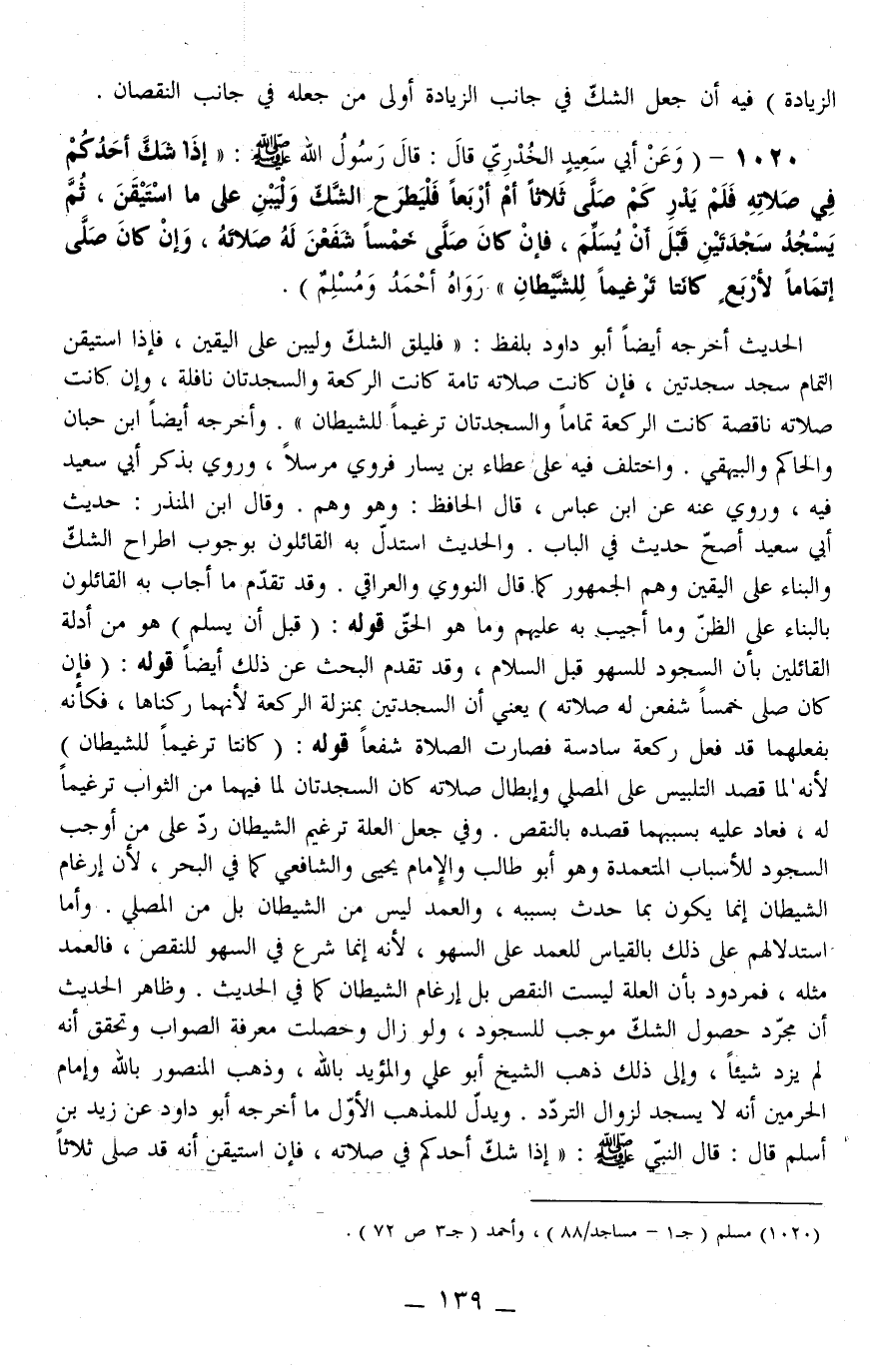1020 - (وَعَنْ أَبِي سَعِيدٍ الْخُدْرِيِّ قَالَ: قَالَ رَسُولُ اللَّهِ - صَلَّى اللَّهُ عَلَيْهِ وَسَلَّمَ -: «إذَا شَكَّ أَحَدُكُمْ فِي صَلَاتِهِ فَلَمْ يَدْرِ كَمْ صَلَّى ثَلَاثًا أَمْ أَرْبَعًا فَلْيَطْرَحْ الشَّكَّ وَلْيَبْنِ عَلَى مَا اسْتَيْقَنَ، ثُمَّ يَسْجُدُ سَجْدَتَيْنِ قَبْلَ أَنْ يُسَلِّمَ، فَإِنْ كَانَ صَلَّى خَمْسًا شَفَعْنَ لَهُ صَلَاتَهُ، وَإِنْ كَانَ صَلَّى إتْمَامًا لِأَرْبَعٍ كَانَتَا تَرْغِيمًا لِلشَّيْطَانِ» رَوَاهُ أَحْمَدُ وَمُسْلِمٌ) الْحَدِيثَ أَخْرَجَهُ أَيْضًا أَبُو دَاوُد بِلَفْظِ: «فَلْيُلْقِ الشَّكَّ وَلْيَبْنِ عَلَى الْيَقِينِ، فَإِذَا اسْتَيْقَنَ التَّمَامَ سَجَدَ سَجْدَتَيْنِ، فَإِنْ كَانَتْ صَلَاتُهُ تَامَّةً كَانَتْ الرَّكْعَةُ وَالسَّجْدَتَانِ نَافِلَةٌ، وَإِنْ كَانَتْ صَلَاتُهُ نَاقِصَةً كَانَتْ الرَّكْعَةُ تَمَامًا وَالسَّجْدَتَانِ تَرْغِيمًا لِلشَّيْطَانِ» . وَأَخْرَجَهُ أَيْضًا ابْنُ حِبَّانَ وَالْحَاكِمُ وَالْبَيْهَقِيُّ. وَاخْتُلِفَ فِيهِ عَلَى عَطَاءِ بْنِ يَسَارٍ فَرُوِيَ مُرْسَلًا، وَرُوِيَ بِذِكْرِ أَبِي سَعِيدٍ فِيهِ، وَرُوِيَ عَنْهُ عَنْ ابْنِ عَبَّاسٍ، قَالَ الْحَافِظُ: وَهُوَ وَهْمٌ. وَقَالَ ابْنُ الْمُنْذِرِ: حَدِيثُ أَبِي سَعِيدٍ أَصَحُّ حَدِيثٍ فِي الْبَابِ. وَالْحَدِيثُ اسْتَدَلَّ بِهِ الْقَائِلُونَ بِوُجُوبِ اطِّرَاحِ الشَّكِّ وَالْبِنَاءِ عَلَى الْيَقِينِ وَهُمْ الْجُمْهُورُ كَمَا قَالَ النَّوَوِيُّ وَالْعِرَاقِيُّ. وَقَدْ تَقَدَّمَ مَا أَجَابَ بِهِ الْقَائِلُونَ بِالْبِنَاءِ عَلَى الظَّنِّ وَمَا أُجِيبَ بِهِ عَلَيْهِمْ وَمَا هُوَ الْحَقُّ.