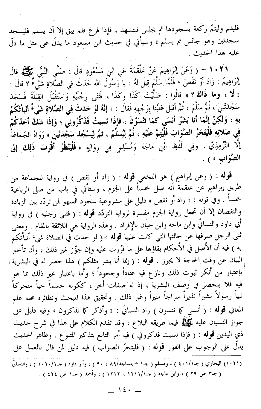1021 - (وَعَنْ إبْرَاهِيمَ عَنْ عَلْقَمَةَ عَنْ ابْنِ مَسْعُودٍ قَالَ: «صَلَّى النَّبِيُّ - صَلَّى اللَّهُ عَلَيْهِ وَسَلَّمَ - قَالَ إبْرَاهِيمُ: زَادَ أَوْ نَقَصَ، فَلَمَّا سَلَّمَ قِيلَ لَهُ: يَا رَسُولَ اللَّهِ حَدَثَ فِي الصَّلَاةِ شَيْءٌ؟ قَالَ: لَا، وَمَا ذَاكَ؟ قَالُوا: صَلَّيْتَ كَذَا وَكَذَا، فَثَنَى رِجْلَيْهِ وَاسْتَقْبَلَ الْقِبْلَةَ فَسَجَدَ سَجْدَتَيْنِ، ثُمَّ سَلَّمَ، ثُمَّ أَقْبَلَ عَلَيْنَا بِوَجْهِهِ فَقَالَ: إنَّهُ لَوْ حَدَثَ فِي الصَّلَاةِ شَيْءٌ أَنْبَأْتُكُمْ بِهِ، وَلَكِنْ إنَّمَا أَنَا بَشَرٌ أَنْسَى كَمَا تَنْسَوْنَ، فَإِذَا نَسِيتُ فَذَكِّرُونِي، وَإِذَا شَكَّ أَحَدُكُمْ فِي صَلَاتِهِ فَلْيَتَحَرَّ الصَّوَابَ فَلْيُتِمَّ عَلَيْهِ، ثُمَّ لِيُسَلِّمْ، ثُمَّ لِيَسْجُدْ سَجْدَتَيْنِ» رَوَاهُ الْجَمَاعَةُ إلَّا التِّرْمِذِيَّ.