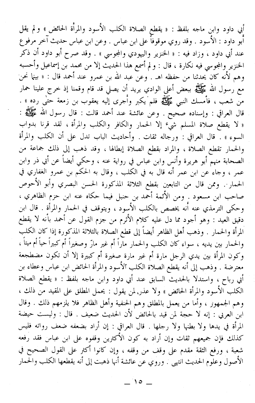 وَذَهَبَ إلَى أَنَّهُ يَقْطَع الصَّلَاةَ الْكَلْبُ الْأَسْوَدُ وَالْمَرْأَةُ الْحَائِضُ ابْنُ عَبَّاسٍ وَعَطَاءُ بْنُ أَبِي رَبَاحٍ، وَاسْتَدَلَّا بِالْحَدِيثِ السَّابِقِ عِنْدَ أَبِي دَاوُد وَابْنِ مَاجَهْ بِلَفْظِ: «يَقْطَعُ الصَّلَاةَ الْكَلْبُ الْأَسْوَدُ وَالْمَرْأَةُ الْحَائِضُ» وَلَا عُذْرَ. لِمَنْ يَقُولُ: يُحْمَلُ الْمُطْلَقُ عَلَى الْمُقَيَّدِ مِنْ ذَلِكَ، وَهُمْ الْجُمْهُورُ، وَأَمَّا مَنْ يَعْمَلُ بِالْمُطْلَقِ وَهُمْ الْحَنَفِيَّةُ وَأَهْلُ الظَّاهِرِ فَلَا يَلْزَمُهُمْ ذَلِكَ