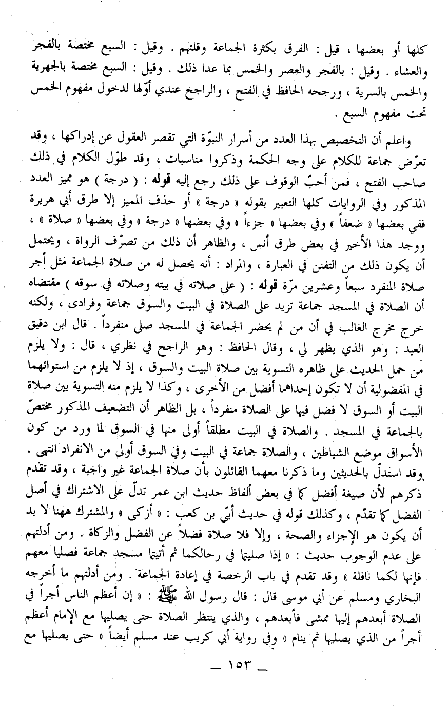 وَقِيلَ: السَّبْعُ مُخْتَصَّةٌ بِالْفَجْرِ وَالْعِشَاءِ. وَقِيلَ: بِالْفَجْرِ وَالْعَصْرِ، وَالْخَمْسُ بِمَا عَدَا ذَلِكَ. وَقِيلَ: السَّبْعُ مُخْتَصَّةٌ بِالْجَهْرِيَّةِ، وَالْخَمْسُ بِالسِّرِّيَّةِ، وَرَجَّحَهُ الْحَافِظُ فِي الْفَتْحِ، وَالرَّاجِحُ عِنْدِي أَوَّلُهَا لِدُخُولِ مَفْهُومِ الْخَمْسِ تَحْتَ مَفْهُومِ السَّبْعِ. وَاعْلَمْ أَنَّ التَّخْصِيصَ بِهَذَا الْعَدَدِ مِنْ أَسْرَارِ النُّبُوَّةِ الَّتِي تَقْصُرُ الْعُقُولُ عَنْ إدْرَاكِهَا، وَقَدْ تَعَرَّضَ جَمَاعَةٌ لِلْكَلَامِ عَلَى وَجْهِ الْحِكْمَةِ وَذَكَرُوا مُنَاسَبَاتٍ، وَقَدْ طَوَّلَ الْكَلَامَ فِي ذَلِكَ صَاحِبُ الْفَتْحِ، فَمَنْ أَحَبَّ الْوُقُوفَ عَلَى ذَلِكَ رَجَعَ إلَيْهِ. قَوْلُهُ: (دَرَجَةً) هُوَ مُمَيِّزُ الْعَدَدِ الْمَذْكُورِ وَفِي الرِّوَايَاتِ كُلِّهَا التَّعْبِيرُ بِقَوْلِهِ " دَرَجَةً " أَوْ حَذْفُ الْمُمَيِّزِ إلَّا طُرُقَ أَبِي هُرَيْرَةَ فَفِي بَعْضِهَا " ضِعْفًا " وَفِي بَعْضِهَا " جُزْءًا " وَفِي بَعْضِهَا " دَرَجَةً " وَفِي بَعْضهَا " صَلَاةً "، وَوُجِدَ هَذَا الْأَخِيرُ فِي بَعْضِ طُرُقِ أَنَسٍ، وَالظَّاهِرُ أَنَّ ذَلِكَ مِنْ تَصَرُّفِ الرُّوَاةِ، وَيُحْتَمَلُ أَنْ يَكُونَ ذَلِكَ مِنْ التَّفَنُّنِ فِي الْعِبَارَةِ، وَالْمُرَادُ: أَنَّهُ يَحْصُلُ لَهُ مِنْ صَلَاةِ الْجَمَاعَةِ مِثْلُ أَجْرِ صَلَاةِ الْمُنْفَرِدِ سَبْعًا وَعِشْرِينَ مَرَّةً.