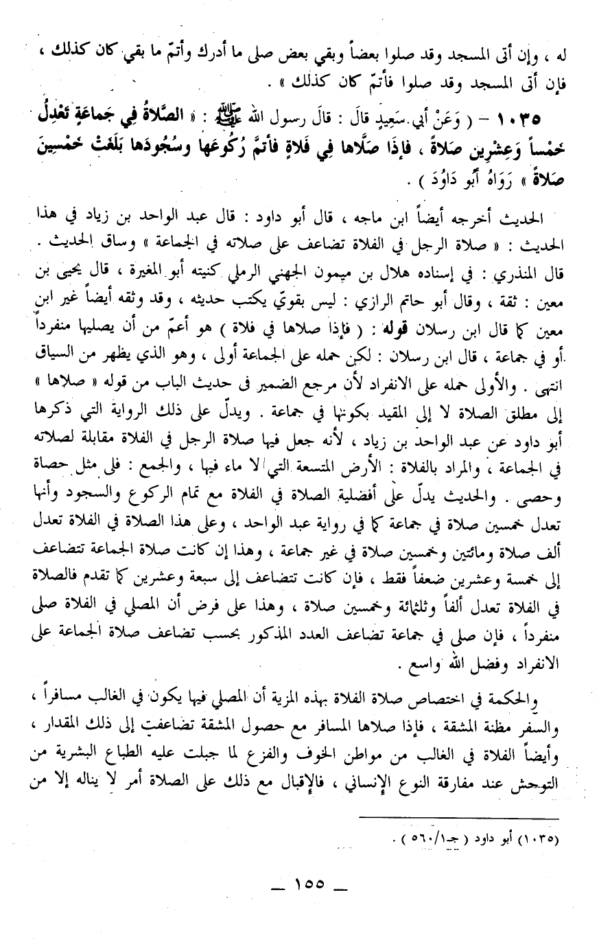 الْحَدِيثُ أَخْرَجَهُ أَيْضًا ابْنُ مَاجَهْ، قَالَ أَبُو دَاوُد: قَالَ عَبْدُ الْوَاحِدِ بْنُ زِيَادٍ فِي هَذَا الْحَدِيثِ: «صَلَاةُ الرَّجُلِ فِي الْفَلَاةِ تُضَاعَفُ عَلَى صَلَاتِهِ فِي الْجَمَاعَةِ» وَسَاقَ الْحَدِيثَ. قَالَ الْمُنْذِرِيُّ: فِي إسْنَادِهِ هِلَالُ بْنُ مَيْمُونٍ الْجُهَنِيِّ الرَّمْلِيُّ كُنْيَتُهُ أَبُو الْمُغِيرَةِ، قَالَ يَحْيَى بْنُ مَعِينٍ: ثِقَةٌ، وَقَالَ أَبُو حَاتِمٍ الرَّازِيّ: لَيْسَ بِقَوِيٍّ يُكْتَبُ حَدِيثُهُ، وَقَدْ وَثَّقَهُ أَيْضًا غَيْرُ ابْنِ مَعِينٍ كَمَا قَالَ ابْنُ رَسْلَانَ قَوْلُهُ: (فَإِذَا صَلَّاهَا فِي فَلَاةٍ) هُوَ أَعَمُّ مِنْ أَنْ يُصَلِّيَهَا مُنْفَرِدًا أَوْ فِي جَمَاعَةٍ، قَالَ ابْنُ رَسْلَانَ: لَكِنَّ حَمْلَهُ عَلَى الْجَمَاعَةِ أَوْلَى، وَهُوَ الَّذِي يَظْهَرُ مِنْ السِّيَاقِ انْتَهَى.