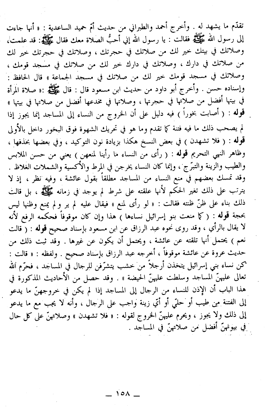 وَأَخْرَجَ أَحْمَدُ وَالطَّبَرَانِيُّ مِنْ حَدِيثِ «أُمِّ حُمَيْدٍ السَّاعِدِيَّةِ: أَنَّهَا جَاءَتْ إلَى رَسُولِ اللَّهِ - صَلَّى اللَّهُ عَلَيْهِ وَسَلَّمَ - فَقَالَتْ: يَا رَسُولَ اللَّهِ إنِّي أُحِبُّ الصَّلَاةَ مَعَكَ فَقَالَ - صَلَّى اللَّهُ عَلَيْهِ وَسَلَّمَ -: قَدْ عَلِمْتُ، وَصَلَاتُكِ فِي بَيْتِكِ خَيْرٌ لَكِ مِنْ صَلَاتِكِ فِي حُجْرَتِكِ، وَصَلَاتُكِ فِي حُجْرَتِكِ خَيْرٌ لَكِ مِنْ صَلَاتِكِ فِي دَارِكِ، وَصَلَاتُكِ فِي دَاركِ خَيْرٌ لَكِ مِنْ صَلَاتِكِ فِي مَسْجِدِ قَوْمِكِ، وَصَلَاتُكِ فِي مَسْجِدِ قَوْمِكِ خَيْرٌ لَكِ مِنْ صَلَاتِكِ فِي مَسْجِدِ الْجَمَاعَةِ» قَالَ الْحَافِظُ: وَإِسْنَادُهُ حَسَنٌ.