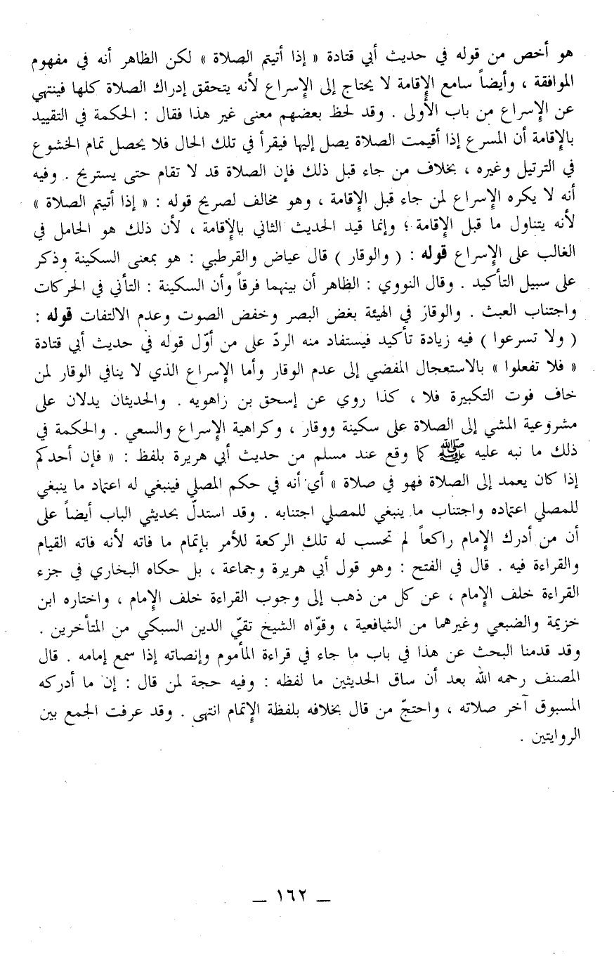 قَوْلُهُ: (وَلَا تُسْرِعُوا) فِيهِ زِيَادَةُ تَأْكِيدٍ فَيُسْتَفَادُ مِنْهُ الرَّدُّ عَلَى مَنْ أَوَّلَ قَوْلَهُ فِي حَدِيثِ أَبِي قَتَادَةَ " فَلَا تَفْعَلُوا " بِالِاسْتِعْجَالِ الْمُفْضِي إلَى عَدَمِ الْوَقَارِ، وَأَمَّا الْإِسْرَاعُ الَّذِي لَا يُنَافِي الْوَقَارَ لِمَنْ خَافَ فَوْتَ التَّكْبِيرَةِ فَلَا، كَذَا رُوِيَ عَنْ إِسْحَاقَ بْنِ رَاهْوَيْهِ. وَالْحَدِيثَانِ يَدُلَّانِ عَلَى مَشْرُوعِيَّةِ الْمَشْيِ إلَى الصَّلَاةِ عَلَى سَكِينَةٍ وَوَقَارٍ وَكَرَاهِيَةِ الْإِسْرَاعِ وَالسَّعْيِ.