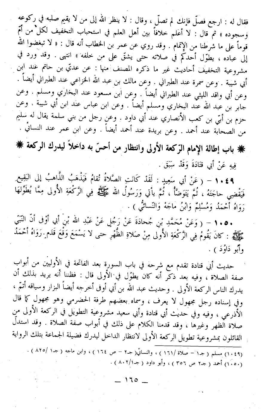 1049 - (عَنْ أَبِي سَعِيدٍ: لَقَدْ «كَانَتْ الصَّلَاةُ تُقَامُ فَيَذْهَبُ الذَّاهِبُ إلَى الْبَقِيعِ فَيَقْضِي حَاجَتَهُ، ثُمَّ يَتَوَضَّأُ، ثُمَّ يَأْتِي وَرَسُولُ اللَّهِ - صَلَّى اللَّهُ عَلَيْهِ وَسَلَّمَ - فِي الرَّكْعَةِ الْأُولَى مِمَّا يُطَوِّلُهَا» رَوَاهُ أَحْمَدُ وَمُسْلِمٌ وَابْنُ مَاجَهْ وَالنَّسَائِيُّ) .