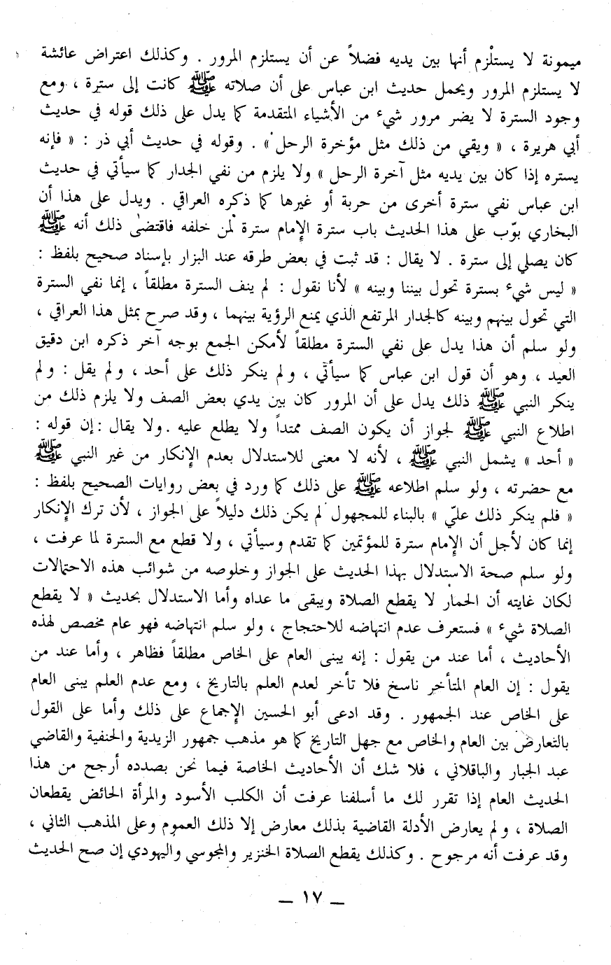 وَأَمَّا الِاسْتِدْلَال بِحَدِيثِ " لَا يَقْطَعُ الصَّلَاةَ شَيْءٌ " فَسَتَعْرِفُ عَدَمَ انْتِهَاضِهِ لِلِاحْتِجَاجِ، وَلَوْ سَلِمَ انْتِهَاضُهُ فَهُوَ عَامٌّ مُخَصِّصٌ لِهَذِهِ الْأَحَادِيثِ، أَمَّا عِنْدَ مَنْ يَقُولُ: إنَّهُ يُبْنَى الْعَامُّ عَلَى الْخَاصِّ مُطْلَقًا فَظَاهِرٌ، وَأَمَّا عِنْدَ مَنْ يَقُولُ: إنَّ الْعَامَّ الْمُتَأَخِّرَ نَاسِخٌ فَلَا تَأَخُّرَ لِعَدَمِ الْعِلْم بِالتَّارِيخِ، وَمَعَ عَدَم الْعِلْمِ يُبْنَى الْعَامُّ عَلَى الْخَاصِّ عِنْدَ الْجُمْهُورِ