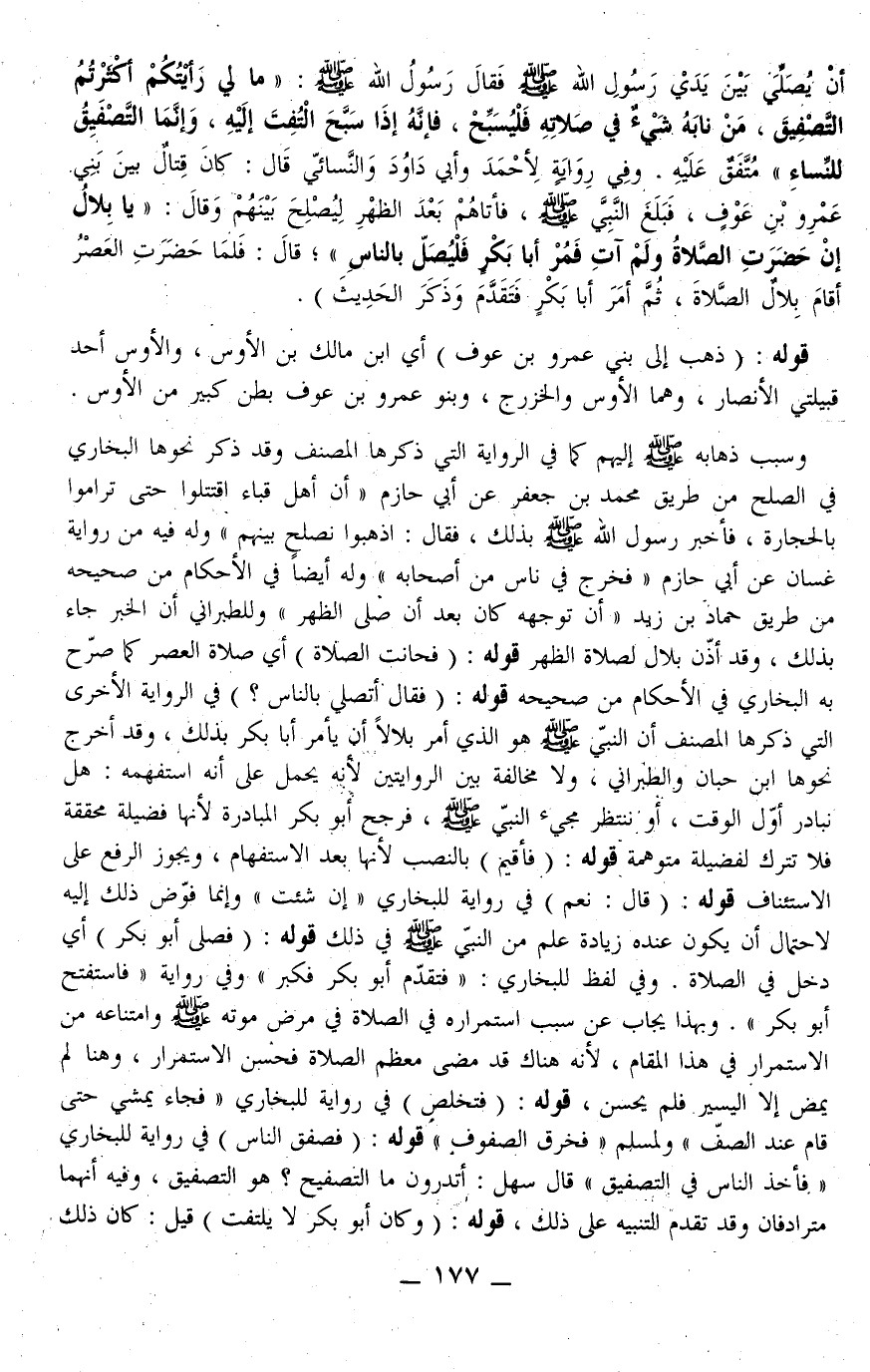 أَنْ يُصَلِّيَ بَيْنَ يَدَيْ رَسُولِ اللَّهِ - صَلَّى اللَّهُ عَلَيْهِ وَسَلَّمَ - فَقَالَ رَسُولُ اللَّهِ - صَلَّى اللَّهُ عَلَيْهِ وَسَلَّمَ -: مَا لِي رَأَيْتُكُمْ أَكْثَرْتُمْ التَّصْفِيقَ، مَنْ نَابَهُ شَيْءٌ فِي صَلَاتِهِ فَلْيُسَبِّحْ، فَإِنَّهُ إذَا سَبَّحَ اُلْتُفِتَ إلَيْهِ، وَإِنَّمَا التَّصْفِيقُ لِلنِّسَاءِ» مُتَّفَقٌ عَلَيْهِ.