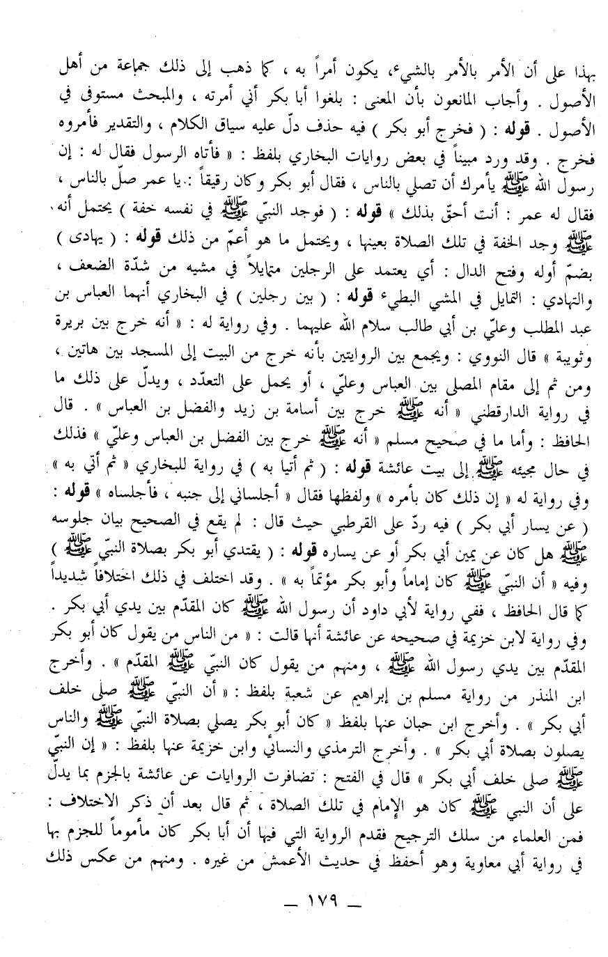 وَأَجَابَ الْمَانِعُونَ بِأَنَّ الْمَعْنَى: بَلِّغُوا أَبَا بَكْرٍ أَنِّي أَمَرْتُهُ، وَالْمَبْحَثُ مُسْتَوْفًى فِي الْأُصُولِ. قَوْلُهُ: (فَخَرَجَ أَبُو بَكْرٍ) فِيهِ حَذْفٌ دَلَّ عَلَيْهِ سِيَاقُ الْكَلَامِ، وَالتَّقْدِيرُ فَأَمَرُوهُ فَخَرَجَ. وَقَدْ وَرَدَ مُبَيَّنًا فِي بَعْضِ رِوَايَاتِ الْبُخَارِيِّ بِلَفْظِ: «فَأَتَاهُ الرَّسُولُ فَقَالَ لَهُ: إنَّ رَسُولَ اللَّهِ - صَلَّى اللَّهُ عَلَيْهِ وَسَلَّمَ - يَأْمُرُكَ أَنْ تُصَلِّيَ بِالنَّاسِ، فَقَالَ أَبُو بَكْرٍ وَكَانَ رَقِيقًا: يَا عُمَرُ صَلِّ بِالنَّاسِ، فَقَالَ لَهُ عُمَرُ: أَنْتَ أَحَقُّ بِذَلِكَ» قَوْلُهُ: (فَوَجَدَ النَّبِيُّ - صَلَّى اللَّهُ عَلَيْهِ وَسَلَّمَ - فِي نَفْسِهِ خِفَّةً) يُحْتَمَلُ أَنَّهُ - صَلَّى اللَّهُ عَلَيْهِ وَسَلَّمَ -. وَجَدَ الْخِفَّةَ فِي تِلْكَ الصَّلَاةِ بِعَيْنِهَا، وَيُحْتَمَلُ مَا هُوَ أَعَمُّ مِنْ ذَلِكَ قَوْلُهُ: (يُهَادَى) بِضَمِّ أَوَّلِهِ وَفَتْحِ الدَّالِ: أَيْ يَعْتَمِدُ عَلَى الرَّجُلَيْنِ مُتَمَايِلًا فِي مَشْيِهِ مِنْ شِدَّةِ الضَّعْفِ، وَالتَّهَادِي: التَّمَايُلُ فِي الْمَشْيِ الْبَطِيءِ قَوْلُهُ: (بَيْنَ رَجُلَيْنِ) فِي الْبُخَارِيِّ أَنَّهُمَا الْعَبَّاسُ بْنُ عَبْدِ الْمُطَّلِبِ وَعَلِيُّ بْنُ أَبِي طَالِبٍ سَلَامُ اللَّهِ عَلَيْهِمَا.