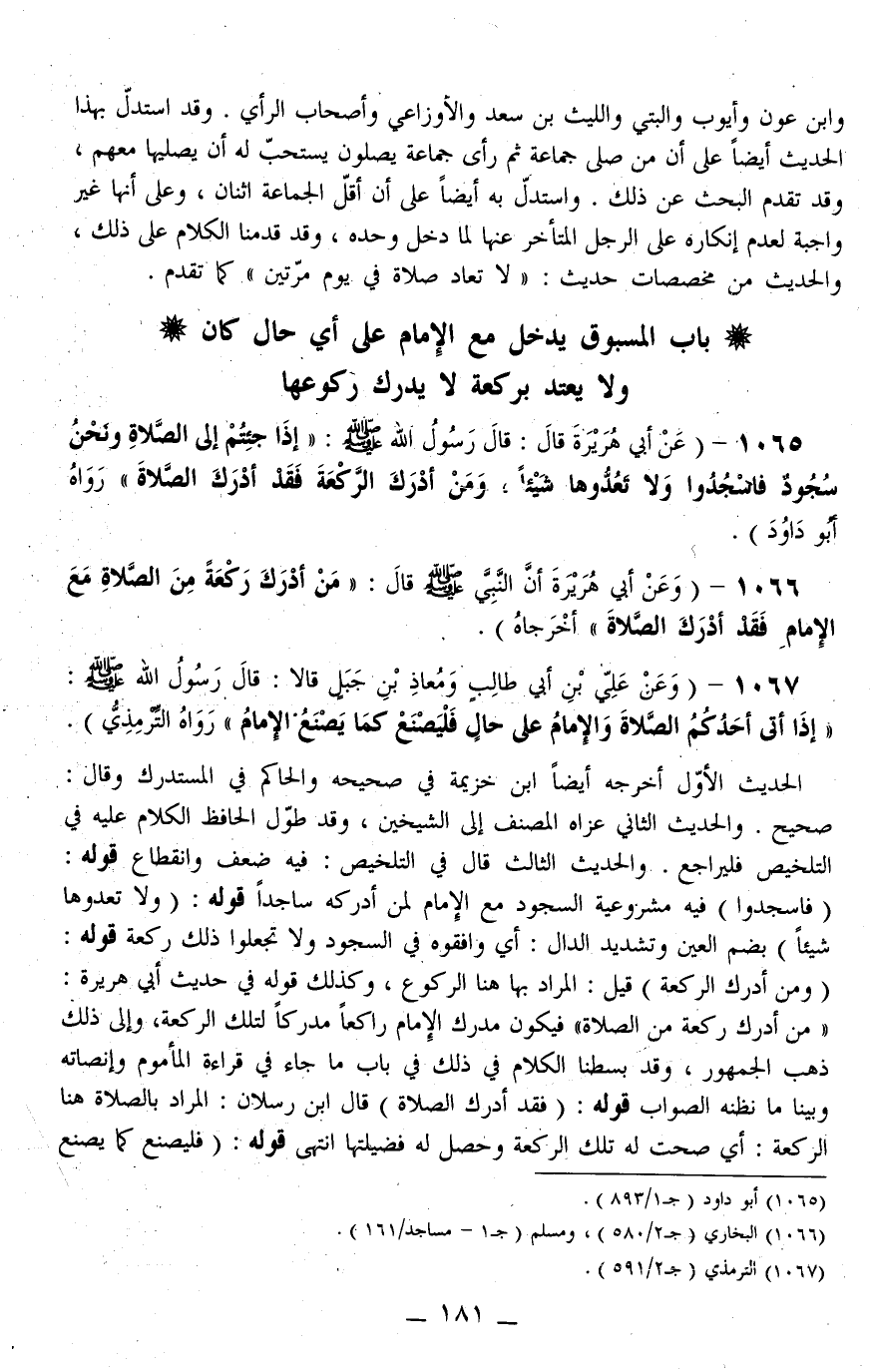 1065 - (عَنْ أَبِي هُرَيْرَةَ قَالَ: قَالَ رَسُولُ اللَّهِ - صَلَّى اللَّهُ عَلَيْهِ وَسَلَّمَ -: «إذَا جِئْتُمْ إلَى الصَّلَاةِ وَنَحْنُ سُجُودٌ فَاسْجُدُوا وَلَا تَعُدُّوهَا شَيْئًا، وَمَنْ أَدْرَكَ الرَّكْعَةَ فَقَدْ أَدْرَكَ الصَّلَاةَ» رَوَاهُ أَبُو دَاوُد) .