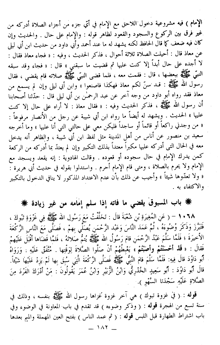 1068 - (عَنْ الْمُغِيرَةِ بْنِ شُعْبَةَ قَالَ: «تَخَلَّفْتُ مَعَ رَسُولِ اللَّهِ - صَلَّى اللَّهُ عَلَيْهِ وَسَلَّمَ - فِي غَزْوَةِ تَبُوكَ، فَتَبَرَّزَ وَذَكَرَ وُضُوءَهُ، ثُمَّ عَمَدَ النَّاسَ وَعَبْدُ الرَّحْمَنِ يُصَلِّي بِهِمْ، فَصَلَّى مَعَ النَّاسِ الرَّكْعَةَ الْأَخِيرَةَ، فَلَمَّا سَلَّمَ عَبْدُ الرَّحْمَنِ قَامَ رَسُولُ اللَّهِ - صَلَّى اللَّهُ عَلَيْهِ وَسَلَّمَ - يُتِمُّ صَلَاتَهُ، فَلَمَّا قَضَاهَا أَقْبَلَ عَلَيْهِمْ فَقَالَ: قَدْ أَحْسَنْتُمْ وَأَصَبْتُمْ يَغْبِطُهُمْ أَنْ صَلَّوْا الصَّلَاةَ لِوَقْتِهَا» . مُتَّفَقٌ عَلَيْهِ. وَرَوَاهُ أَبُو دَاوُد قَالَ فِيهِ: «فَلَمَّا سَلَّمَ قَامَ النَّبِيُّ - صَلَّى اللَّهُ عَلَيْهِ وَسَلَّمَ - فَصَلَّى الرَّكْعَةَ الَّتِي سُبِقَ بِهَا لَمْ يَزِدْ عَلَيْهَا شَيْئًا» . قَالَ أَبُو دَاوُد أَبُو سَعِيدٍ الْخُدْرِيِّ وَابْنُ الزُّبَيْرِ وَابْنُ عُمَرَ يَقُولُونَ: مَنْ أَدْرَكَ الْفَرْدَ مِنْ الصَّلَاةِ عَلَيْهِ سَجْدَتَا السَّهْوِ) .