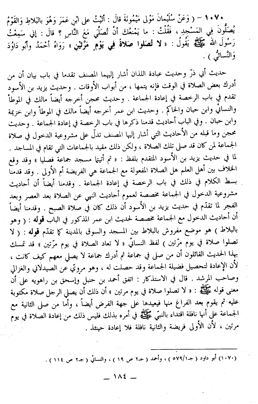 1070 - (وَعَنْ سُلَيْمَانَ مَوْلَى مَيْمُونَةَ قَالَ: «أَتَيْتُ عَلَى ابْنِ عُمَرَ وَهُوَ بِالْبَلَاطِ وَالْقَوْمُ يُصَلُّونَ فِي الْمَسْجِدِ، فَقُلْتُ: مَا يَمْنَعُكَ أَنْ تُصَلِّيَ مَعَ النَّاسِ؟ قَالَ: إنِّي سَمِعْتُ رَسُولَ اللَّهِ - صَلَّى اللَّهُ عَلَيْهِ وَسَلَّمَ - يَقُولُ: لَا تُصَلُّوا صَلَاةً فِي يَوْمٍ مَرَّتَيْنِ» رَوَاهُ أَحْمَدُ وَأَبُو دَاوُد وَالنَّسَائِيُّ) .