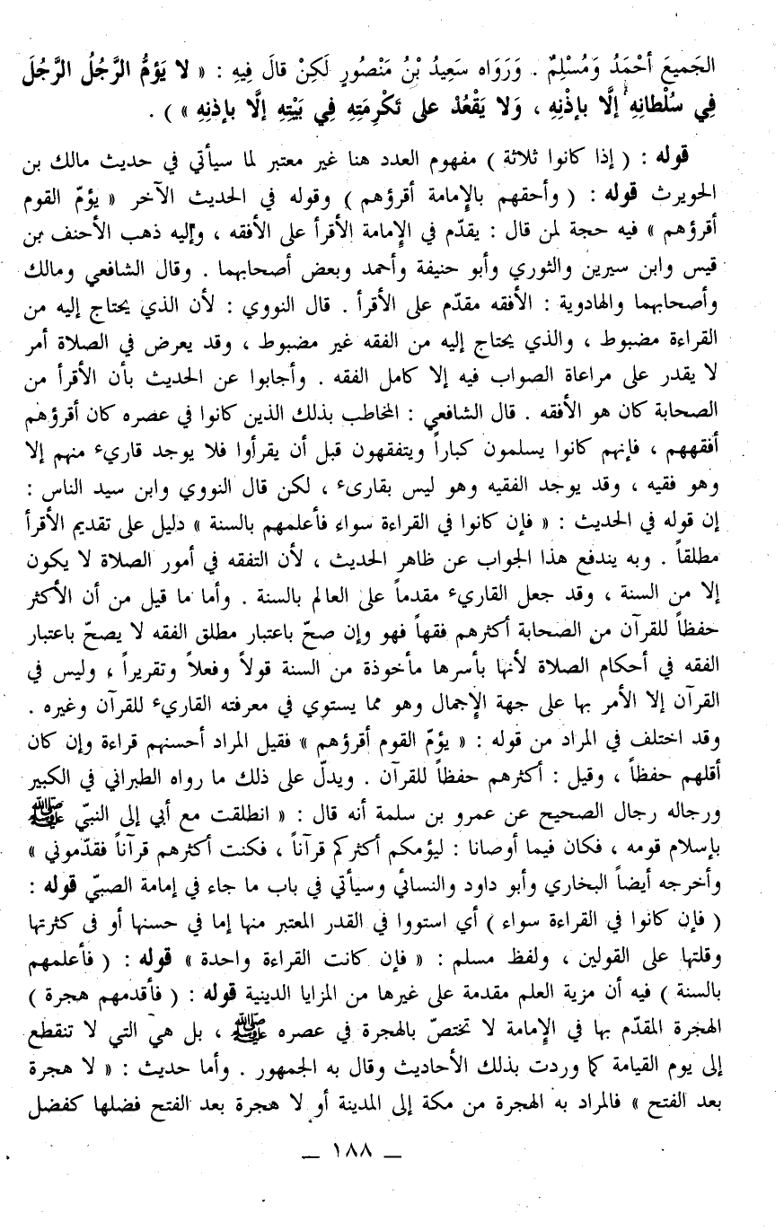 الْجَمِيعُ أَحْمَدُ وَمُسْلِمٌ. وَرَوَاهُ سَعِيدُ بْنُ مَنْصُورٍ لَكِنْ قَالَ فِيهِ: «لَا يَؤُمُّ الرَّجُلُ الرَّجُلَ فِي سُلْطَانِهِ إلَّا بِإِذْنِهِ، وَلَا يَقْعُدُ عَلَى تَكْرِمَتِهِ فِي بَيْتِهِ إلَّا بِإِذْنِهِ»