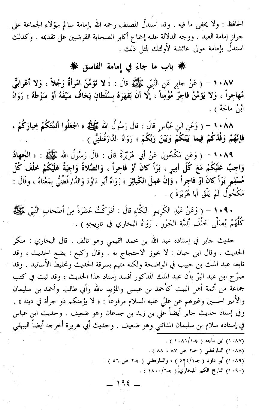1087 - (عَنْ جَابِرٍ عَنْ النَّبِيِّ - صَلَّى اللَّهُ عَلَيْهِ وَسَلَّمَ - قَالَ: «لَا تَؤُمَّنَّ امْرَأَةٌ رَجُلًا، وَلَا أَعْرَابِيٌّ مُهَاجِرًا، وَلَا يَؤُمَّنَّ فَاجِرٌ مُؤْمِنًا، إلَّا أَنْ يَقْهَرَهُ بِسُلْطَانٍ يَخَافُ سَيْفَهُ أَوْ سَوْطَهُ» رَوَاهُ ابْنُ مَاجَهْ) .
