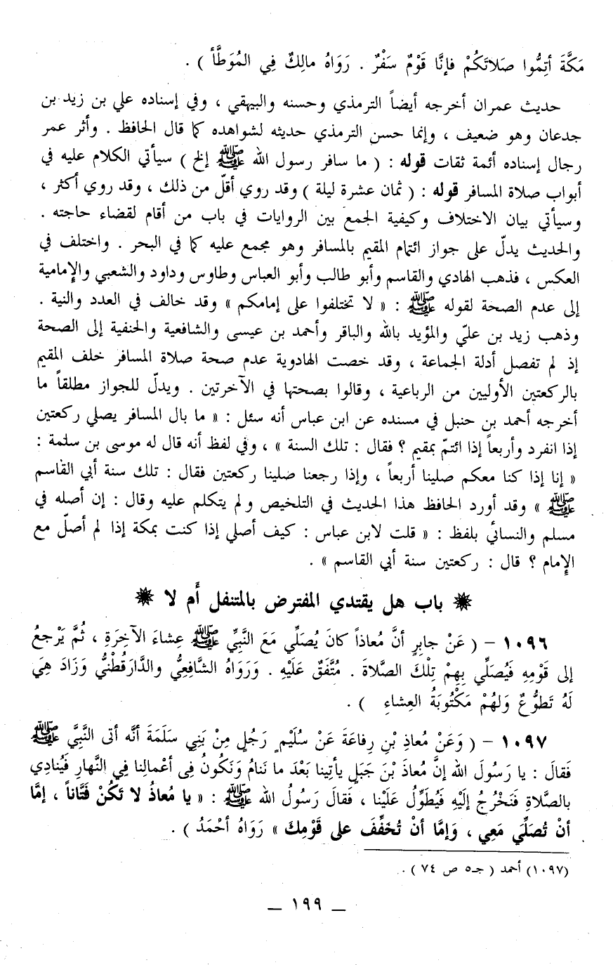 1097 - (وَعَنْ مُعَاذِ بْنِ رِفَاعَةَ عَنْ سُلَيْمٍ رَجُلٍ مِنْ بَنِي سَلِمَةَ أَنَّهُ أَتَى النَّبِيَّ - صَلَّى اللَّهُ عَلَيْهِ وَسَلَّمَ - فَقَالَ: «يَا رَسُولَ اللَّهِ إنَّ مُعَاذَ بْنَ جَبَلٍ يَأْتِينَا بَعْدَ مَا نَنَامُ وَنَكُونُ فِي أَعْمَالِنَا فِي النَّهَارِ فَيُنَادِي بِالصَّلَاةِ فَنَخْرُجُ إلَيْهِ فَيُطَوِّلُ عَلَيْنَا، فَقَالَ رَسُولُ اللَّهِ - صَلَّى اللَّهُ عَلَيْهِ وَسَلَّمَ -: يَا مُعَاذُ لَا تَكُنْ فَتَّانًا، إمَّا أَنْ تُصَلِّيَ مَعِي، وَإِمَّا أَنْ تُخَفِّفَ عَلَى قَوْمِكَ» رَوَاهُ أَحْمَدُ) .