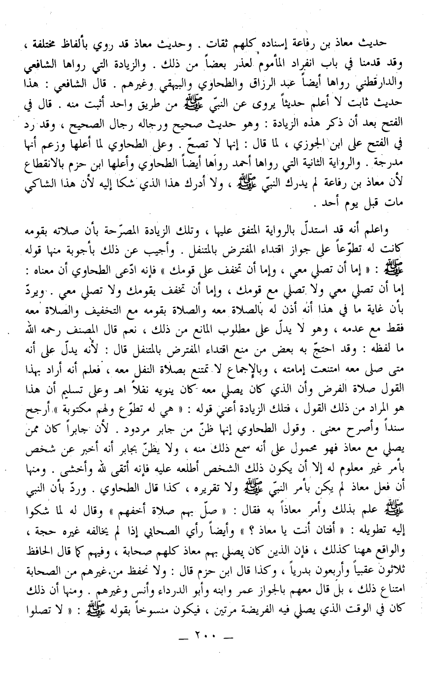 حَدِيثُ مُعَاذِ بْنِ رِفَاعَةَ إسْنَادُهُ كُلُّهُمْ ثِقَاتٌ. وَحَدِيثُ مُعَاذٍ قَدْ رُوِيَ بِأَلْفَاظٍ مُخْتَلِفَةٍ، وَقَدْ قَدَّمْنَا فِي بَابِ انْفِرَادِ الْمَأْمُومِ لِعُذْرٍ بَعْضًا مِنْ ذَلِكَ. وَالزِّيَادَة الَّتِي رَوَاهَا الشَّافِعِيُّ وَالدَّارَقُطْنِيّ رَوَاهَا أَيْضًا عَبْدُ الرَّزَّاقِ وَالطَّحَاوِيُّ وَالْبَيْهَقِيُّ وَغَيْرُهُمْ. قَالَ الشَّافِعِيُّ: هَذَا حَدِيثٌ ثَابِتٌ لَا أَعْلَمُ حَدِيثًا يُرْوَى عَنْ النَّبِيِّ - صَلَّى اللَّهُ عَلَيْهِ وَسَلَّمَ - مِنْ طَرِيقٍ وَاحِدٍ أَثْبَتُ مِنْهُ. قَالَ فِي الْفَتْحِ بَعْد أَنْ ذَكَر هَذِهِ الزِّيَادَة: وَهُوَ حَدِيثٌ صَحِيحٌ وَرِجَالُهُ رِجَالُ الصَّحِيح، وَقَدْ رَدَّ فِي الْفَتْحِ عَلَى ابْنِ الْجَوْزِيِّ لَمَّا قَالَ: إنَّهَا لَا تَصِحُّ. وَعَلَى الطَّحَاوِيِّ لَمَّا أَعَلَّهَا وَزَعَمَ أَنَّهَا مُدْرَجَةٌ. وَالرِّوَايَةُ الثَّانِيَةُ الَّتِي رَوَاهَا أَحْمَدُ رَوَاهَا أَيْضًا الطَّحَاوِيُّ وَأَعَلَّهَا ابْنُ حَزْمٍ بِالِانْقِطَاعِ لِأَنَّ مُعَاذَ بْنَ رِفَاعَةَ لَمْ يُدْرِك النَّبِيّ - صَلَّى اللَّهُ عَلَيْهِ وَسَلَّمَ -، وَلَا أَدْرَكَ هَذَا الَّذِي شَكَا إلَيْهِ لِأَنَّ هَذَا الشَّاكِيَ مَاتَ قَبْلَ يَوْمِ أُحُدٍ.