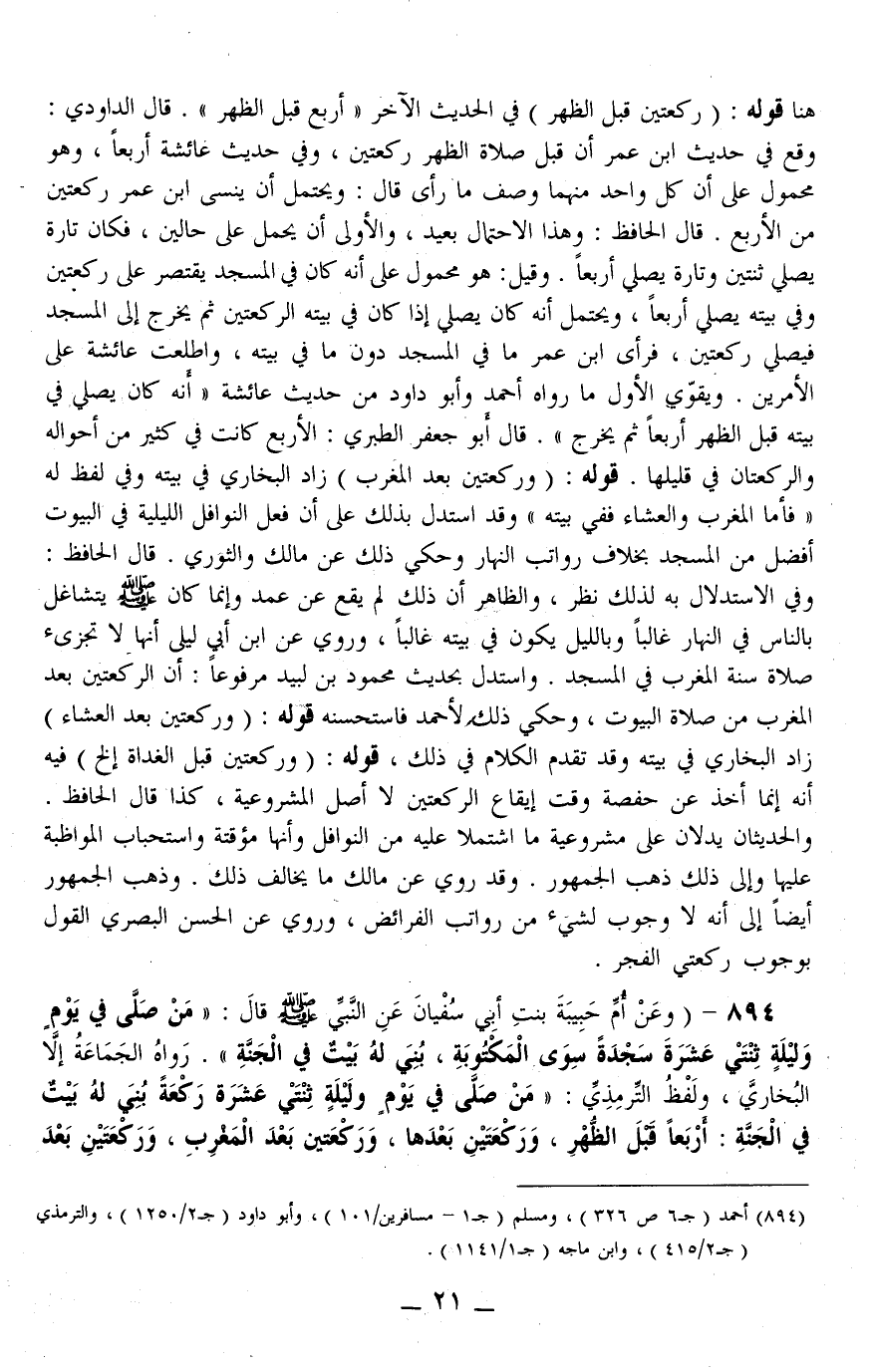 894 - (وَعَنْ أُمِّ حَبِيبَةَ بِنْتِ أَبِي سُفْيَانَ عَنْ النَّبِيِّ - صَلَّى اللَّهُ عَلَيْهِ وَسَلَّمَ - قَالَ: «مَنْ صَلَّى فِي يَوْمٍ وَلَيْلَةٍ ثِنْتَيْ عَشْرَةَ سَجْدَةً سِوَى الْمَكْتُوبَةِ، بُنِيَ لَهُ بَيْتٌ فِي الْجَنَّةِ» رَوَاهُ الْجَمَاعَةُ إلَّا الْبُخَارِيَّ، وَلَفْظُ التِّرْمِذِيِّ: «مَنْ صَلَّى فِي يَوْمٍ وَلَيْلَةٍ ثِنْتَيْ عَشْرَةَ رَكْعَةً بُنِيَ لَهُ بَيْتٌ فِي الْجَنَّةِ: أَرْبَعًا قَبْلَ الظُّهْرِ، وَرَكْعَتَيْنِ بَعْدَهَا، وَرَكْعَتَيْنِ بَعْدَ الْمَغْرِبِ، وَرَكْعَتَيْنِ بَعْدَ