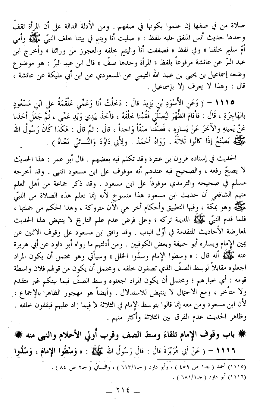 1115 - (وَعَنْ «الْأَسْوَدِ بْنِ يَزِيدَ قَالَ: دَخَلْتُ أَنَا وَعَمِّي عَلْقَمَةُ عَلَى ابْنِ مَسْعُودٍ بِالْهَاجِرَةِ، قَالَ: فَأَقَامَ الظُّهْرَ لِيُصَلِّيَ فَقُمْنَا خَلْفَهُ، فَأَخَذَ بِيَدِي وَيَدِ عَمِّي، ثُمَّ جَعَلَ أَحَدَنَا عَنْ يَمِينِهِ وَالْآخَرَ عَنْ يَسَارِهِ، فَصَفَّنَا صَفًّا وَاحِدًا، قَالَ: ثُمَّ قَالَ: هَكَذَا كَانَ رَسُولُ اللَّهِ - صَلَّى اللَّهُ عَلَيْهِ وَسَلَّمَ - يَصْنَعُ إذَا كَانُوا ثَلَاثَةً» . رَوَاهُ أَحْمَدُ. وَلِأَبِي دَاوُد وَالنَّسَائِيُّ مَعْنَاهُ) .