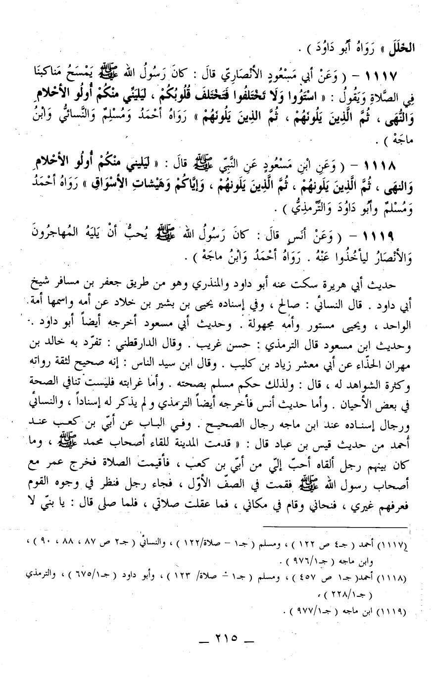 1117 - (وَعَنْ أَبِي مَسْعُود الْأَنْصَارِيِّ قَالَ: «كَانَ رَسُولُ اللَّهِ - صَلَّى اللَّهُ عَلَيْهِ وَسَلَّمَ - يَمْسَحُ مَنَاكِبَنَا فِي الصَّلَاةِ وَيَقُولُ: اسْتَوُوا وَلَا تَخْتَلِفُوا فَتَخْتَلِفَ قُلُوبُكُمْ، لِيَلِيَنِّي مِنْكُمْ أُولُو الْأَحْلَامِ وَالنُّهَى، ثُمَّ الَّذِينَ يَلُونَهُمْ، ثُمَّ الَّذِينَ يَلُونَهُمْ» رَوَاهُ أَحْمَدُ وَمُسْلِمٌ وَالنَّسَائِيُّ وَابْنُ مَاجَهْ) .