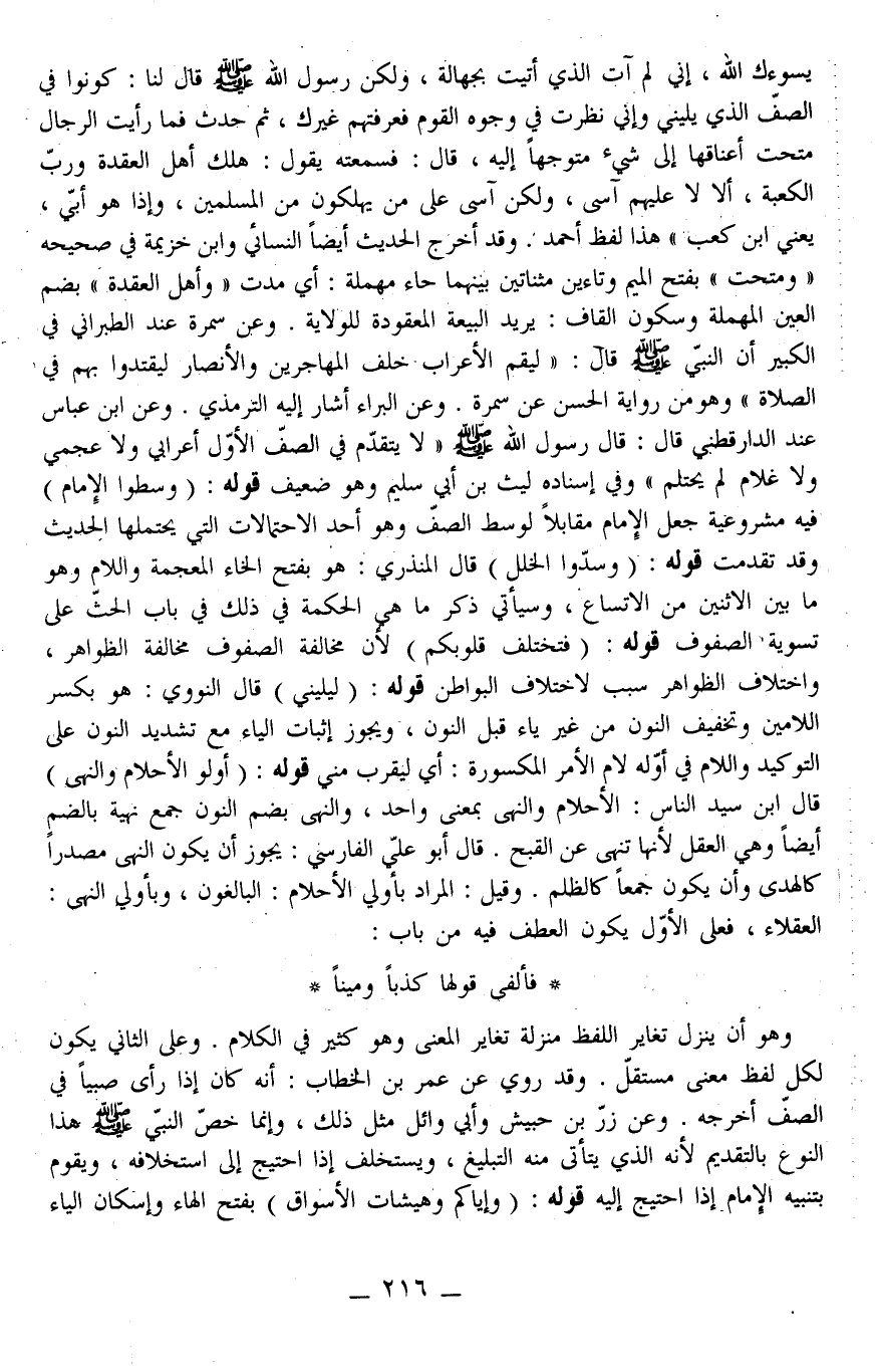 وَسَيَأْتِي ذِكْر مَا هِيَ الْحِكْمَة فِي ذَلِكَ فِي بَاب الْحَثّ عَلَى تَسْوِيَة الصُّفُوف قَوْله: (فَتَخْتَلِفَ قُلُوبُكُمْ) لِأَنَّ مُخَالَفَة الصُّفُوف مُخَالَفَة الظَّوَاهِر، وَاخْتِلَاف الظَّوَاهِر سَبَب لِاخْتِلَافِ الْبَوَاطِن قَوْله: (لِيَلِيَنِّي) قَالَ النَّوَوِيُّ: هُوَ بِكَسْرِ اللَّامَيْنِ وَتَخْفِيفِ النُّون مِنْ غَيْر يَاء قَبْل النُّون، وَيَجُوز إثْبَات الْيَاء مَعَ تَشْدِيد النُّون عَلَى التَّوْكِيد وَاللَّام فِي أَوَّله لَام الْأَمْر الْمَكْسُورَة: أَيْ لِيَقْرُب مِنِّي قَوْله: (أُولُو الْأَحْلَام وَالنُّهَى) قَالَ ابْنُ سَيِّدِ النَّاسِ: الْأَحْلَام وَالنُّهَى بِمَعْنًى وَاحِد، وَالنُّهَى بِضَمِّ النُّون جَمْع نُهْيَة بِالضَّمِّ أَيْضًا وَهِيَ الْعَقْل لِأَنَّهَا تَنْهَى عَنْ الْقُبْح. قَالَ أَبُو عَلِيٍّ الْفَارِسِيُّ: يَجُوز أَنْ يَكُون النُّهَى مَصْدَرًا كَالْهُدَى وَأَنْ يَكُون جَمْعًا كَالظُّلَمِ. وَقِيلَ: الْمُرَاد بِأُولِي الْأَحْلَام: الْبَالِغُونَ، وَبِأُولِي النُّهَى: الْعُقَلَاء، فَعَلَى الْأَوَّل يَكُون الْعَطْف فِيهِ مِنْ بَاب: