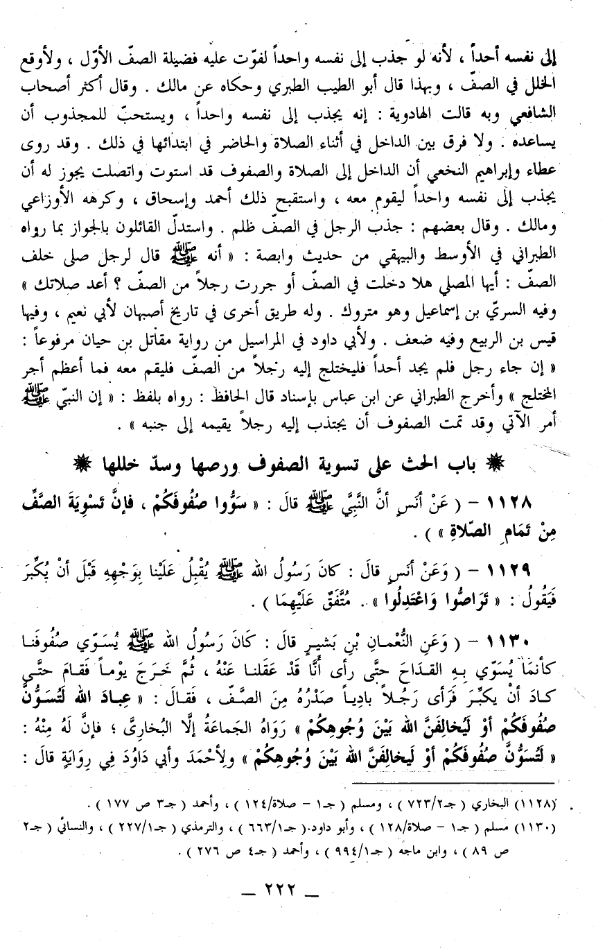 1130 - (وَعَنْ النُّعْمَانِ بْنِ بَشِيرٍ قَالَ: «كَانَ رَسُولُ اللَّهِ - صَلَّى اللَّهُ عَلَيْهِ وَسَلَّمَ - يُسَوِّي صُفُوفَنَا كَأَنَّمَا يُسَوِّي بِهِ الْقِدَاحَ حَتَّى رَأَى أَنَّا قَدْ عَقَلْنَا عَنْهُ، ثُمَّ خَرَجَ يَوْمًا فَقَامَ حَتَّى كَادَ أَنْ يُكَبِّرَ فَرَأَى رَجُلًا بَادِيًا صَدْرُهُ مِنْ الصَّفِّ، فَقَالَ: عِبَادَ اللَّهِ لَتُسَوُّنَّ صُفُوفَكُمْ أَوْ لَيُخَالِفَنَّ اللَّهُ بَيْنَ وُجُوهِكُمْ» رَوَاهُ الْجَمَاعَة إلَّا الْبُخَارِيَّ فَإِنَّ لَهُ مِنْهُ: «لَتُسَوُّنَّ صُفُوفَكُمْ أَوْ لَيُخَالِفَنَّ اللَّهُ بَيْنَ وُجُوهِكُمْ» وَلِأَحْمَدَ وَأَبِي دَاوُد فِي رِوَايَة قَالَ: