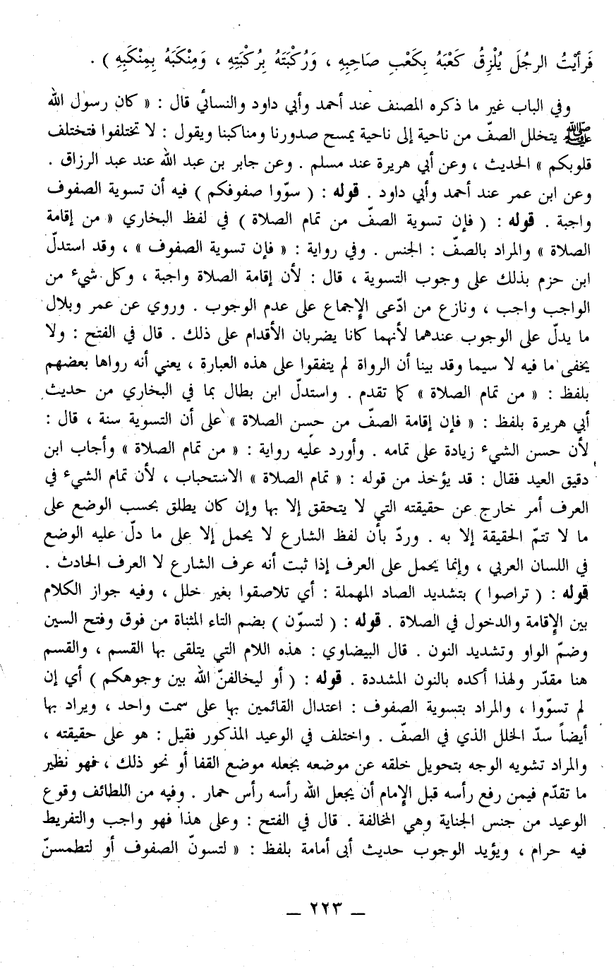 قَالَ فِي الْفَتْحِ: وَعَلَى هَذَا فَهُوَ وَاجِب وَالتَّفْرِيط فِيهِ حَرَام، وَيُؤَيِّد الْوُجُوب حَدِيث أَبِي أُمَامَةَ بِلَفْظِ: «لَتُسَوُّنَّ الصُّفُوف أَوْ لَتُطْمَسَنَّ