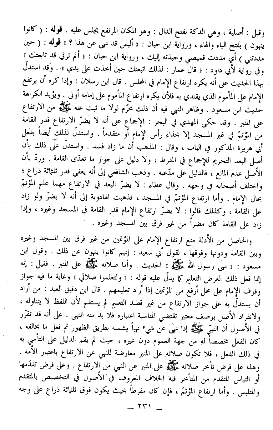 وَالْحَاصِل مِنْ الْأَدِلَّة مَنْع ارْتِفَاع الْإِمَام عَلَى الْمُؤْتَمِّينَ مِنْ غَيْر فَرْق بَيْن الْمَسْجِد وَغَيْره وَبَيْن الْقَامَة وَدُونهَا وَفَوْقهَا، لِقَوْلِ أَبِي سَعِيدٍ: إنَّهُمْ كَانُوا يُنْهَوْنَ عَنْ ذَلِكَ. وَقَوْل ابْنِ مَسْعُودٍ: " نَهَى رَسُولُ اللَّهِ - صَلَّى اللَّهُ عَلَيْهِ وَسَلَّمَ - " الْحَدِيث. وَأَمَّا صَلَاته - صَلَّى اللَّهُ عَلَيْهِ وَسَلَّمَ - عَلَى الْمِنْبَر. فَقِيلَ: إنَّهُ إنَّمَا فَعَلَ ذَلِكَ لِغَرَضِ التَّعْلِيم كَمَا يَدُلّ عَلَيْهِ قَوْله: «وَلِتَعْلَمُوا صَلَاتِي» وَغَايَة مَا فِيهِ جَوَاز وُقُوف الْإِمَام عَلَى مَحَلّ أَرْفَع مِنْ الْمُؤْتَمِّينَ إذَا أَرَادَ تَعْلِيمهمْ
