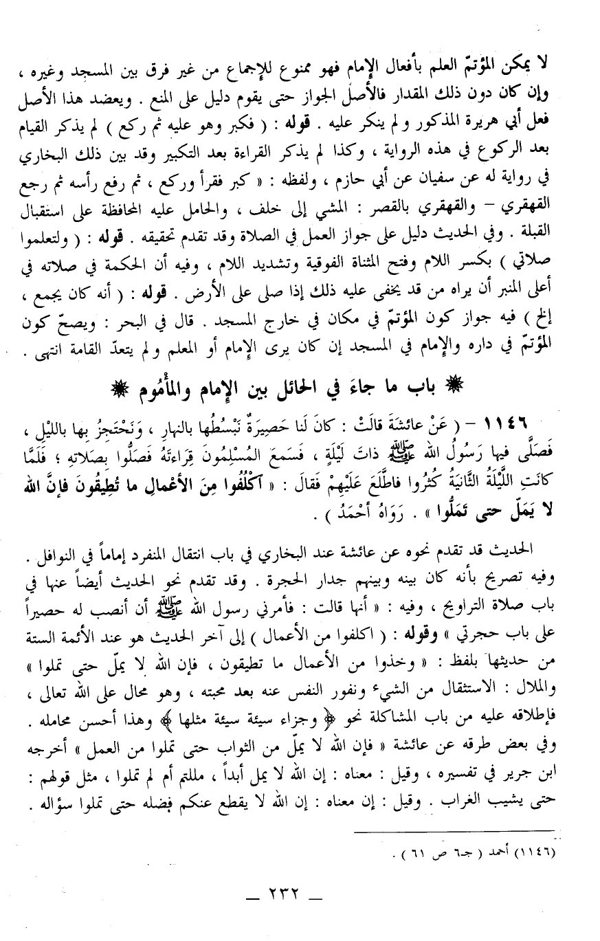 1146 - (عَنْ عَائِشَةَ قَالَتْ: «كَانَ لَنَا حَصِيرَةٌ نَبْسُطُهَا بِالنَّهَارِ، وَنَحْتَجِزُ بِهَا بِاللَّيْلِ، فَصَلَّى فِيهَا رَسُولُ اللَّهِ - صَلَّى اللَّهُ عَلَيْهِ وَسَلَّمَ - ذَاتَ لَيْلَةٍ، فَسَمِعَ الْمُسْلِمُونَ قِرَاءَته فَصَلَّوْا بِصَلَاتِهِ، فَلَمَّا كَانَتْ اللَّيْلَةُ الثَّانِيَةُ كَثُرُوا فَاطَّلَعَ عَلَيْهِمْ فَقَالَ: اكْلَفُوا مِنْ الْأَعْمَالِ مَا تُطِيقُونَ فَإِنَّ اللَّهَ لَا يَمَلُّ حَتَّى تَمَلُّوا» رَوَاهُ أَحْمَدُ) .