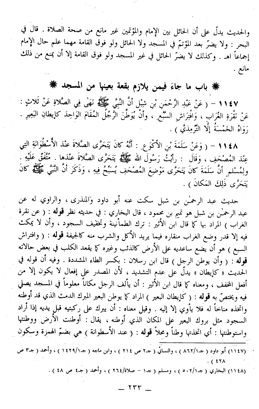 1147 - (عَنْ عَبْدِ الرَّحْمَنِ بْنِ شِبْلٍ «أَنَّ النَّبِيَّ - صَلَّى اللَّهُ عَلَيْهِ وَسَلَّمَ - نَهَى فِي الصَّلَاةِ عَنْ ثَلَاثٍ: عَنْ نَقْرَةِ الْغُرَابِ، وَافْتِرَاشِ السَّبُعِ، وَأَنْ يُوَطِّنَ الرَّجُلُ الْمُقَامَ الْوَاحِدَ كَإِيطَانِ الْبَعِيرِ» . رَوَاهُ الْخَمْسَة إلَّا التِّرْمِذِيَّ) .