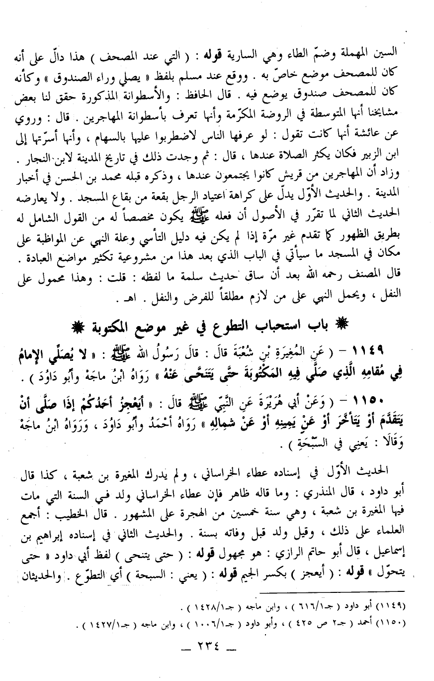 1149 - (عَنْ الْمُغِيرَةِ بْنِ شُعْبَةَ قَالَ: قَالَ رَسُولُ اللَّهِ - صَلَّى اللَّهُ عَلَيْهِ وَسَلَّمَ -: «لَا يُصَلِّي الْإِمَامُ فِي مُقَامِهِ الَّذِي صَلَّى فِيهِ الْمَكْتُوبَة حَتَّى يَتَنَحَّى عَنْهُ» رَوَاهُ ابْنُ مَاجَهْ وَأَبُو دَاوُد) .