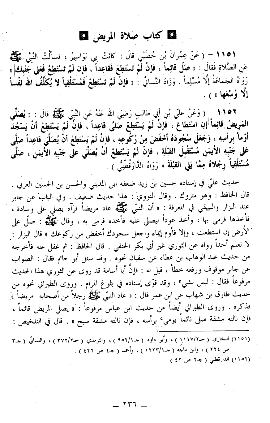 1151 - ( «عَنْ عِمْرَانَ بْنِ حُصَيْنٍ قَالَ: كَانَتْ بِي بَوَاسِيرُ، فَسَأَلْتُ النَّبِيَّ - صَلَّى اللَّهُ عَلَيْهِ وَسَلَّمَ - عَنْ الصَّلَاةِ فَقَالَ: صَلِّ قَائِمًا، فَإِنْ لَمْ تَسْتَطِعْ فَقَاعِدًا، فَإِنْ لَمْ تَسْتَطِعْ فَعَلَى جَنْبِكَ» رَوَاهُ الْجَمَاعَة إلَّا مُسْلِمًا. وَزَادَ النَّسَائِيّ: " فَإِنْ لَمْ تَسْتَطِعْ فَمُسْتَلْقِيًا لَا يُكَلِّفُ اللَّهُ نَفْسًا إلَّا وُسْعَهَا ") .