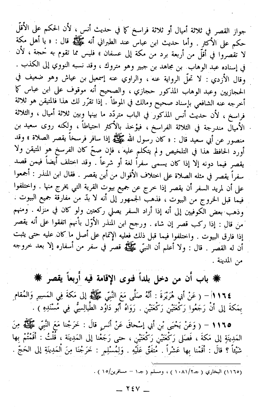 ـــــــــــــــــــــــــــــQجَوَاز الْقَصْر فِي ثَلَاثَة أَمْيَال أَوْ ثَلَاثَة فَرَاسِخَ كَمَا فِي حَدِيثِ أَنَسٍ، لِأَنَّ الْحُكْم عَلَى الْأَقَلّ حُكْم عَلَى الْأَكْثَر وَأَمَّا حَدِيث ابْنِ عَبَّاسٍ عِنْدَ الطَّبَرَانِيِّ أَنَّهُ - صَلَّى اللَّهُ عَلَيْهِ وَسَلَّمَ - قَالَ: «يَا أَهْلَ مَكَّةَ لَا تَقْصُرُوا فِي أَقَلَّ مِنْ أَرْبَعَةِ بُرُدٍ مِنْ مَكَّةَ إلَى عُسْفَانَ» فَلَيْسَ مِمَّا تَقُوم بِهِ حُجَّة، لِأَنَّ فِي إسْنَاده عَبْدَ الْوَهَّابِ بْنَ مُجَاهِدِ بْنِ جَبْرٍ وَهُوَ مَتْرُوك، وَقَدْ نَسَبه النَّوَوِيُّ إلَى الْكَذِبِ وَقَالَ الْأَزْدِيُّ: لَا تَحِلّ الرِّوَايَة عَنْهُ، وَالرَّاوِي عَنْهُ إسْمَاعِيلُ بْنُ عَيَّاشٍ وَهُوَ ضَعِيف فِي الْحِجَازِيِّينَ وَعَبْدُ الْوَهَّابِ الْمَذْكُور حِجَازِيّ، وَالصَّحِيحُ أَنَّهُ مَوْقُوف عَلَى ابْنِ عَبَّاسٍ كَمَا أَخْرَجَهُ عَنْهُ الشَّافِعِيُّ بِإِسْنَادٍ صَحِيحٍ وَمَالِكٌ فِي الْمُوَطَّأِ.