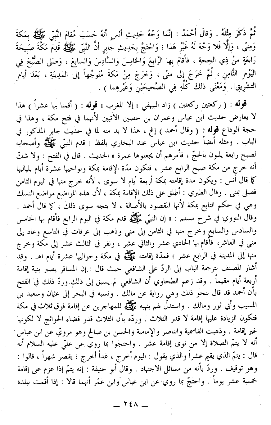 قَوْلُهُ: (رَكْعَتَيْنِ رَكْعَتَيْنِ) زَادَ الْبَيْهَقِيُّ إلَّا الْمَغْرِب " قَوْلُهُ: (أَقَمْنَا بِهَا عَشْرًا) هَذَا لَا يُعَارِض حَدِيثَ ابْنِ عَبَّاسٍ وَعِمْرَانَ بْنِ حُصَيْنٍ الْآتِيَيْنِ لِأَنَّهُمَا فِي فَتْح مَكَّةَ، وَهَذَا فِي حَجَّةِ الْوَدَاعِ قَوْلُهُ: (وَقَالَ أَحْمَدُ) . . . إلَخْ، هَذَا لَا بُدّ مِنْهُ لِمَا فِي حَدِيثِ جَابِرٍ الْمَذْكُور فِي الْبَابِ. وَمِثْله أَيْضًا حَدِيثُ ابْنِ عَبَّاسٍ عِنْدَ الْبُخَارِيِّ بِلَفْظِ «قَدِمَ النَّبِيُّ - صَلَّى اللَّهُ عَلَيْهِ وَسَلَّمَ - وَأَصْحَابُهُ لِصُبْحِ رَابِعَةٍ يُلَبُّونَ بِالْحَجِّ، فَأَمَرَهُمْ أَنْ يَجْعَلُوهَا عُمْرَةً» الْحَدِيث. قَالَ فِي الْفَتْحِ: وَلَا شَكَّ أَنَّهُ خَرَجَ مِنْ مَكَّةَ صُبْحَ الرَّابِعَ عَشَرَ، فَتَكُونُ مُدَّةُ الْإِقَامَةِ بِمَكَّةَ وَنَوَاحِيهَا عَشَرَةَ أَيَّام بِلَيَالِيهَا كَمَا قَالَ أَنَسٌ: وَيَكُون مُدَّة إقَامَته بِمَكَّةَ أَرْبَعَة أَيَّام لَا سِوَى، لِأَنَّهُ خَرَجَ مِنْهَا فِي الْيَوْم الثَّامِن فَصَلَّى بِمِنًى.