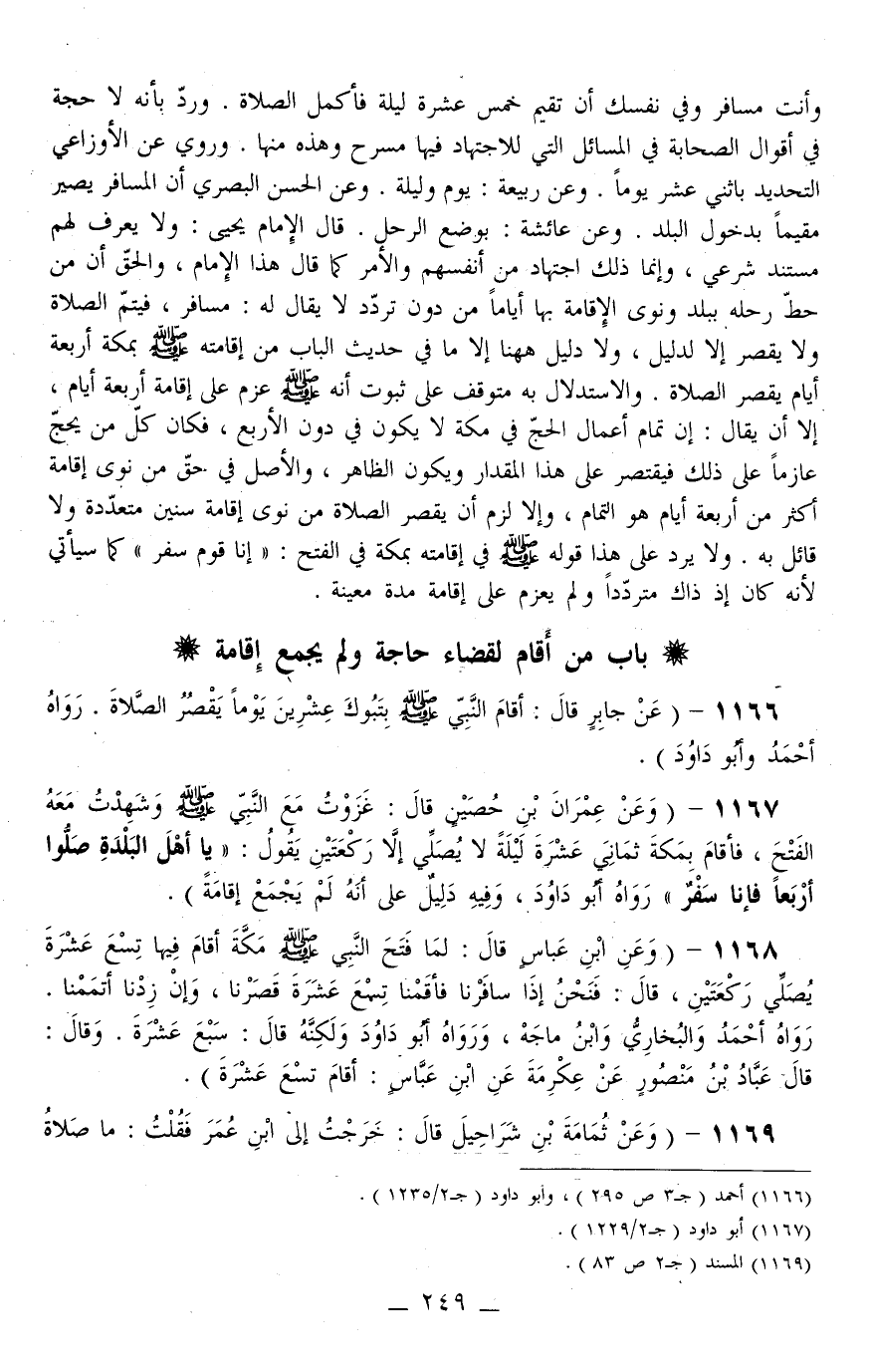1166 - (عَنْ جَابِرٍ قَالَ: «أَقَامَ النَّبِيُّ - صَلَّى اللَّهُ عَلَيْهِ وَسَلَّمَ - بِتَبُوكَ عِشْرِينَ يَوْمًا يَقْصُرُ الصَّلَاةَ» . رَوَاهُ أَحْمَدُ وَأَبُو دَاوُد) .