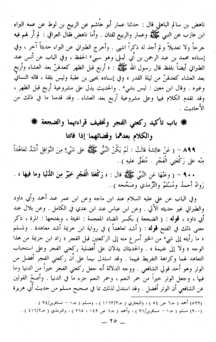 وَفِي الْبَابِ عَنْ عَلِيٍّ - عَلَيْهِ السَّلَامُ - عِنْدَ ابْنِ مَاجَهْ وَعَنْ ابْنِ عُمَرَ عِنْدَ أَحْمَدَ وَأَبِي دَاوُد وَالطَّبَرَانِيِّ غَيْرُ حَدِيثِهِ الْآتِي. وَعَنْ ابْنِ عَبَّاسٍ عِنْدَ ابْنِ عَدِيٍّ فِي الْكَامِلِ. وَعَنْ بِلَالٍ عِنْدَ أَبِي دَاوُد، قَوْلُهُ: (الضِّجْعَةُ) بِكَسْرِ الضَّادِ الْمُعْجَمَةِ: الْهَيْئَةُ، وَبِفَتْحِهَا: الْمَرَّةُ، ذَكَرَ مَعْنَى ذَلِكَ فِي الْفَتْحِ قَوْلُهُ: (أَشَدَّ تَعَاهُدًا) فِي رِوَايَةِ ابْنِ خُزَيْمَةَ أَشَدَّ مُعَاهَدَةً. وَلِمُسْلِمٍ «مَا رَأَيْتُهُ إلَى شَيْءٍ مِنْ الْخَيْرِ أَسْرَعَ مِنْهُ إلَى الرَّكْعَتَيْنِ قَبْلَ الْفَجْرِ» زَادَ ابْنُ خُزَيْمَةَ مِنْ هَذَا الْوَجْهِ " وَلَا إلَى غَنِيمَةٍ ". وَالْحَدِيثَانِ يَدُلَّانِ عَلَى أَفْضَلِيَّةِ رَكْعَتَيْ الْفَجْرِ وَعَلَى اسْتِحْبَابِ التَّعَاهُدِ لَهُمَا وَكَرَاهَةِ التَّفْرِيطِ فِيهِمَا. وَقَدْ اُسْتُدِلَّ بِهِمَا عَلَى أَنَّ رَكْعَتَيْ الْفَجْر أَفْضَلُ مِنْ الْوِتْرِ وَهُوَ أَحَدُ قَوْلَيْ الشَّافِعِيِّ. وَوَجْهُ الدَّلَالَةِ أَنَّهُ جَعَلَ رَكْعَتَيْ الْفَجْرِ خَيْرًا مِنْ الدُّنْيَا وَمَا فِيهَا، وَجَعَلَ الْوِتْرَ خَيْرًا مِنْ حُمْر النَّعَم، وَحُمْرُ النَّعَمِ جُزْءُ مَا فِي الدُّنْيَا. وَأَصَحُّ الْقَوْلَيْنِ عَنْ الشَّافِعِيِّ أَنَّ الْوِتْرَ أَفْضَلُ. وَقَدْ اُسْتُدِلَّ لِذَلِكَ بِمَا فِي صَحِيحِ مُسْلِمٍ مِنْ حَدِيثِ أَبِي هُرَيْرَةَ