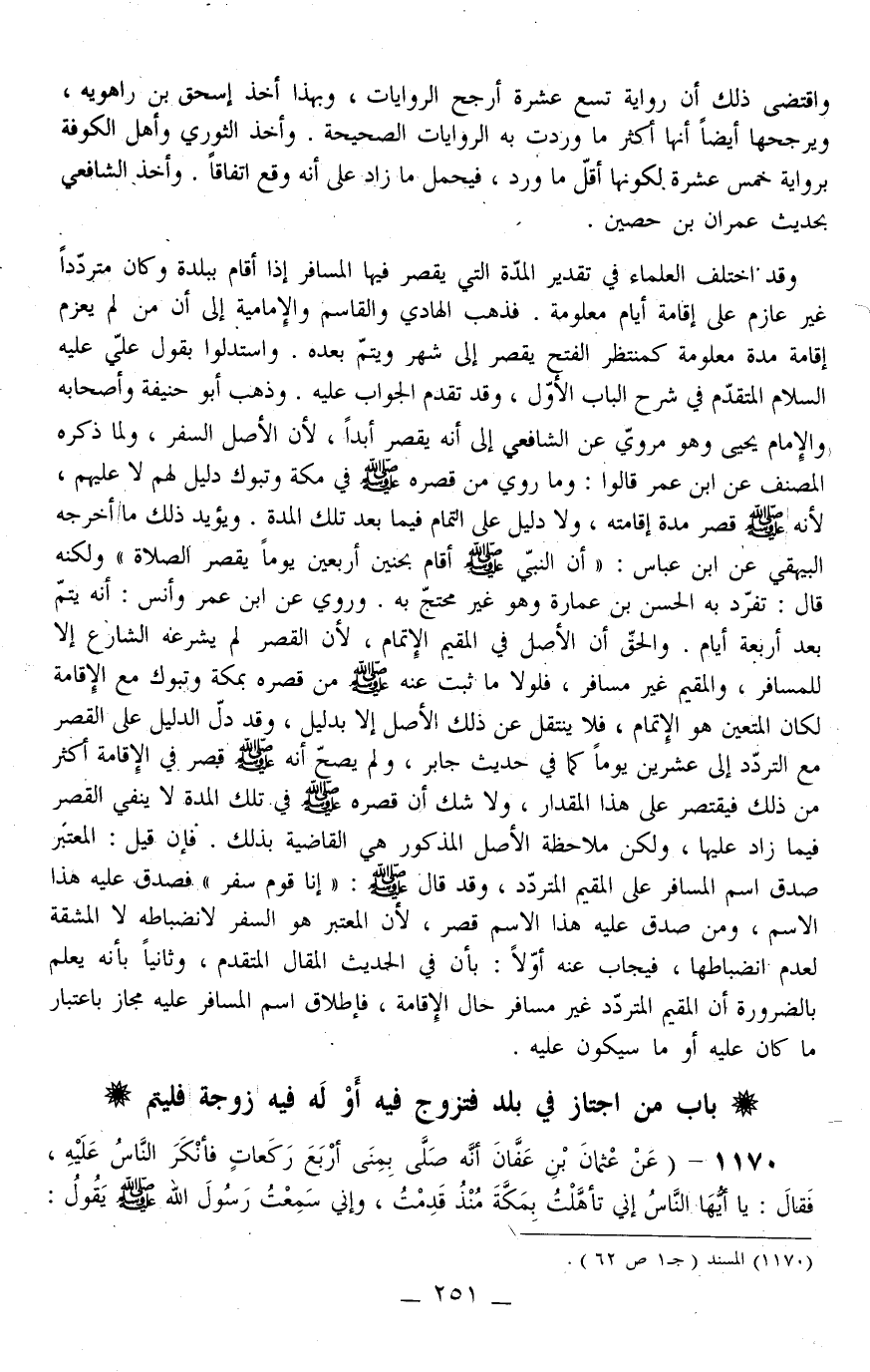 ـــــــــــــــــــــــــــــQوَاقْتَضَى ذَلِكَ أَنَّ رِوَايَة تِسْع عَشْرَة أَرْجَحُ الرِّوَايَات، وَبِهَذَا أَخَذَ إِسْحَاقُ بْنُ رَاهْوَيْهِ، وَيُرَجِّحهَا أَيْضًا أَنَّهَا أَكْثَر مَا وَرَدَتْ بِهِ الرِّوَايَات الصَّحِيحَة وَأَخَذَ الثَّوْرِيُّ وَأَهْل الْكُوفَةِ بِرِوَايَةِ خَمْس عَشْرَة لِكَوْنِهَا أَقَلّ مَا وَرَدَ، فَيُحْمَل مَا زَادَ عَلَى أَنَّهُ وَقَعَ اتِّفَاقًا. وَأَخَذَ الشَّافِعِيُّ بِحَدِيثِ عِمْرَانَ بْنِ حُصَيْنٍ. وَقَدْ اخْتَلَفَ الْعُلَمَاءُ فِي تَقْدِير الْمُدَّةِ الَّتِي يَقْصُرُ فِيهَا الْمُسَافِرُ إذَا أَقَامَ بِبَلْدَةٍ وَكَانَ مُتَرَدِّدًا غَيْرَ عَازِمٍ عَلَى إقَامَةِ أَيَّامٍ مَعْلُومَةٍ. فَذَهَبَ الْهَادِي وَالْقَاسِمُ وَالْإِمَامِيَّةُ إلَى أَنَّ مَنْ لَمْ يَعْزِم إقَامَة مُدَّة مَعْلُومَة كَمُنْتَظِرِ الْفَتْحِ يَقْصُر إلَى شَهْر وَيُتِمّ بَعْده.