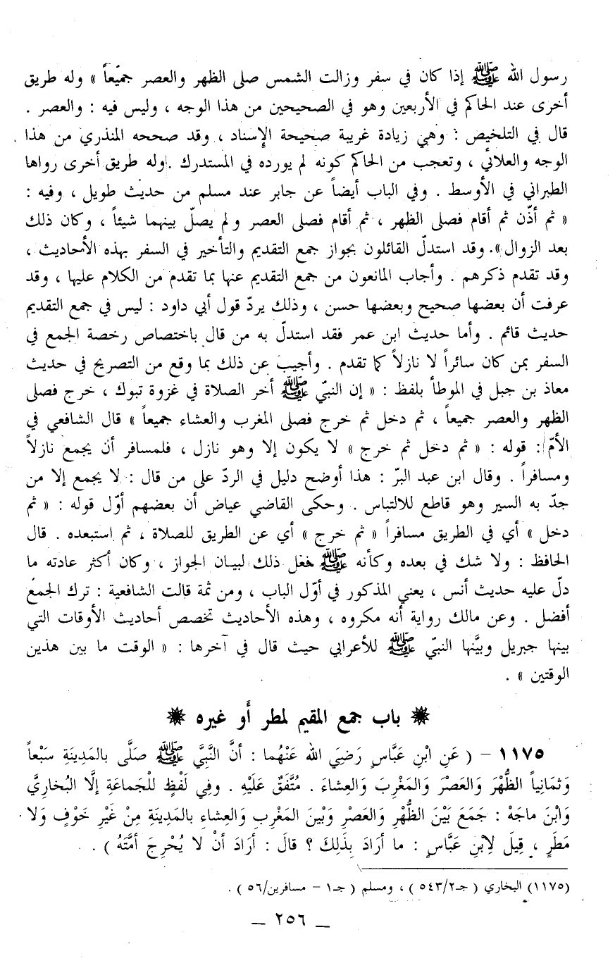 ـــــــــــــــــــــــــــــQرَسُولُ اللَّهِ - صَلَّى اللَّهُ عَلَيْهِ وَسَلَّمَ - إذَا كَانَ فِي سَفَرٍ وَزَالَتْ الشَّمْسُ صَلَّى الظُّهْرَ وَالْعَصْرَ جَمِيعًا» وَلَهُ طَرِيق أُخْرَى عِنْدَ الْحَاكِمِ فِي الْأَرْبَعِينَ وَهُوَ فِي الصَّحِيحَيْنِ مِنْ هَذَا الْوَجْه، وَلَيْسَ فِيهِ: وَالْعَصْر قَالَ فِي التَّلْخِيص: وَهِيَ زِيَادَة غَرِيبَة صَحِيحَة الْإِسْنَاد، وَقَدْ صَحَّحَهُ الْمُنْذِرِيُّ مِنْ هَذَا الْوَجْه وَالْعَلَائِيُّ، وَتَعَجَّبَ مِنْ الْحَاكِمِ كَوْنه لَمْ يُورِدهُ فِي الْمُسْتَدْرَكِ. وَلَهُ طَرِيق أُخْرَى رَوَاهَا الطَّبَرَانِيُّ فِي الْأَوْسَطِ.