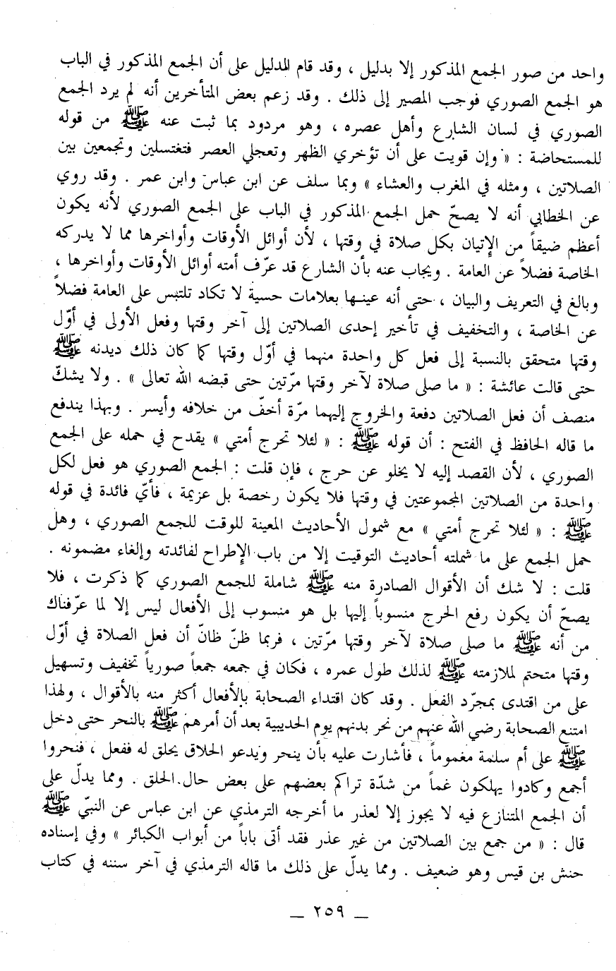 وَقَدْ زَعَمَ بَعْض الْمُتَأَخِّرِينَ أَنَّهُ لَمْ يَرِد الْجَمْعُ الصُّورِيّ فِي لِسَانِ الشَّارِعِ وَأَهْل عَصْره، وَهُوَ مَرْدُود بِمَا ثَبَتَ عَنْهُ - صَلَّى اللَّهُ عَلَيْهِ وَسَلَّمَ - مِنْ «قَوْله لِلْمُسْتَحَاضَةِ: وَإِنْ قَوِيَتْ عَلَى أَنْ تُؤَخِّرِي الظُّهْرَ وَتُعَجِّلِي الْعَصْرَ فَتَغْتَسِلِينَ وَتَجْمَعِينَ بَيْنَ الصَّلَاتَيْنِ، وَمِثْلُهُ فِي الْمَغْرِبِ وَالْعِشَاءِ» وَبِمَا سَلَفَ عَنْ ابْنِ عَبَّاسٍ وَابْنِ عُمَرَ. وَقَدْ رُوِيَ عَنْ الْخَطَّابِيِّ أَنَّهُ لَا يَصِحّ حَمْل الْجَمْع الْمَذْكُور فِي الْبَابِ عَلَى الْجَمْع الصُّورِيّ لِأَنَّهُ يَكُون أَعْظَم ضِيقَا مِنْ الْإِتْيَان بِكُلِّ صَلَاة فِي وَقْتهَا، لِأَنَّ أَوَائِل الْأَوْقَات وَأَوَاخِرهَا مِمَّا لَا يُدْرِكهُ الْخَاصَّة فَضْلًا عَنْ الْعَامَّة