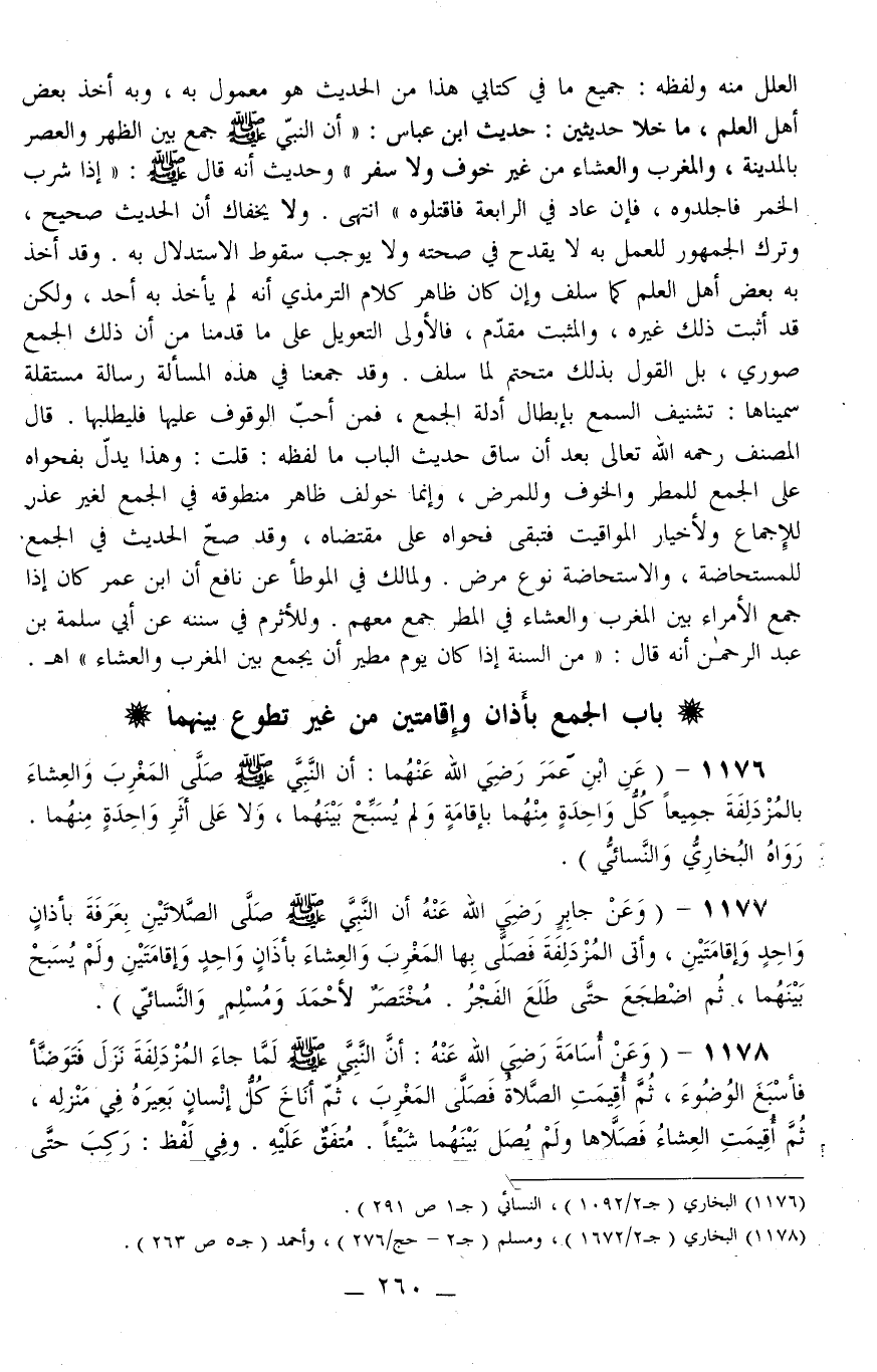 1176 - (عَنْ ابْنِ عُمَرَ - رَضِيَ اللَّهُ عَنْهُمَا -: «أَنَّ النَّبِيَّ - صَلَّى اللَّهُ عَلَيْهِ وَسَلَّمَ - صَلَّى الْمَغْرِبَ وَالْعِشَاءَ بِالْمُزْدَلِفَةِ جَمِيعًا كُلُّ وَاحِدَةٍ مِنْهُمَا بِإِقَامَةٍ وَلَمْ يُسَبِّحْ بَيْنَهُمَا، وَلَا عَلَى أَثَرِ وَاحِدَةٍ مِنْهُمَا» . رَوَاهُ الْبُخَارِيّ وَالنَّسَائِيُّ) .