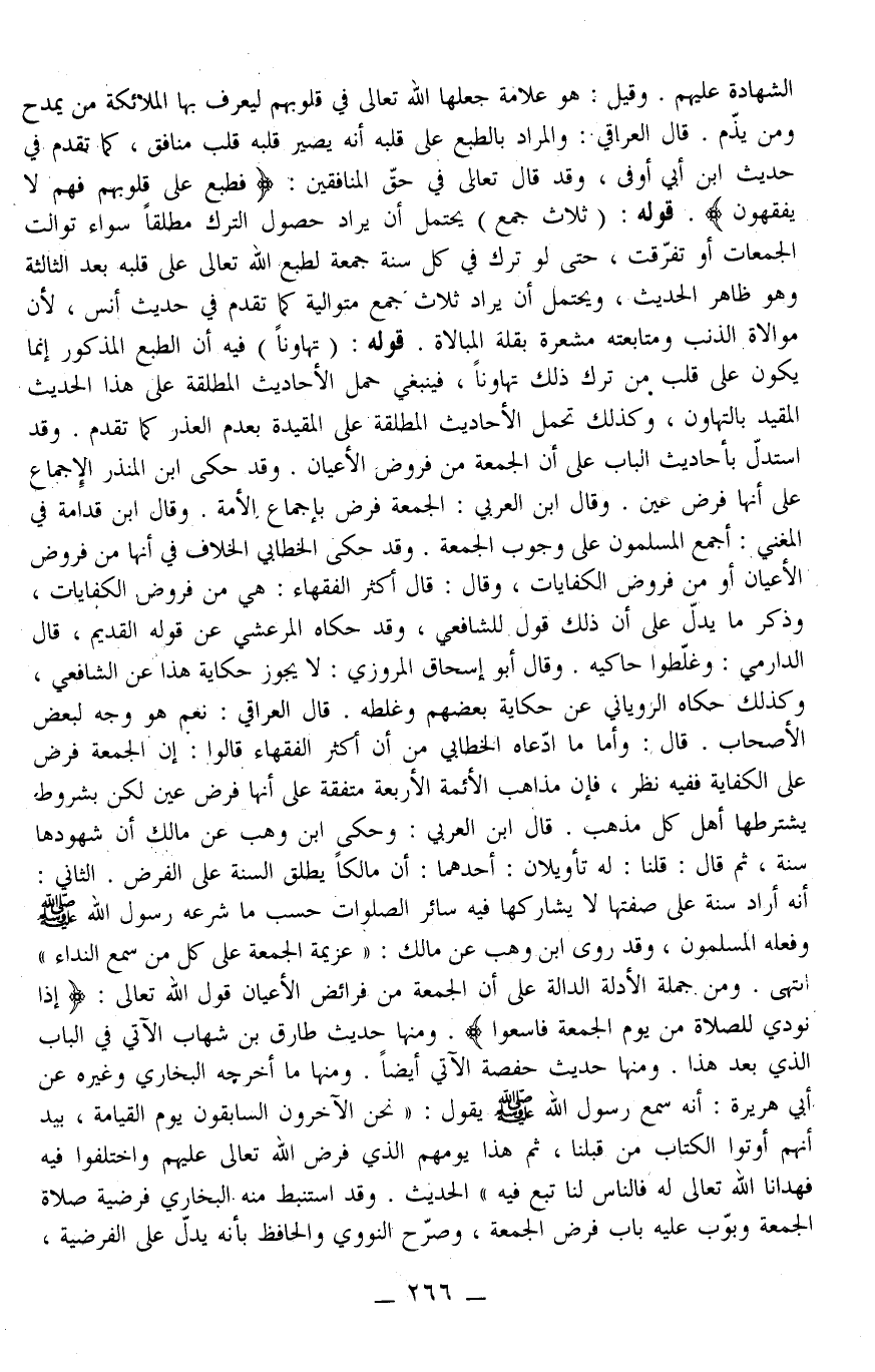 ـــــــــــــــــــــــــــــQالشَّهَادَة عَلَيْهِمْ. وَقِيلَ: هُوَ عَلَامَة جَعَلَهَا اللَّه تَعَالَى فِي قُلُوبهمْ لِيَعْرِف بِهَا الْمَلَائِكَة مَنْ يَمْدَحُ وَمَنْ يَذُمّ. قَالَ الْعِرَاقِيُّ: وَالْمُرَادُ بِالطَّبْعِ عَلَى قَلْبه أَنَّهُ يَصِير قَلْبه قَلْبَ مُنَافِق، كَمَا تَقَدَّمَ فِي حَدِيثِ ابْنِ أَبِي أَوْفَى، وَقَدْ قَالَ تَعَالَى فِي حَقّ الْمُنَافِقِينَ: {فَطُبِعَ عَلَى قُلُوبِهِمْ فَهُمْ لا يَفْقَهُونَ} [المنافقون: 3] . قَوْلُهُ: (ثَلَاثَ جُمَع) يُحْتَمَل أَنْ يُرَاد حُصُول التَّرْك مُطْلَقًا سَوَاء تَوَالَتْ الْجُمُعَات أَوْ تَفَرَّقَتْ، حَتَّى لَوْ تَرَكَ فِي كُلّ سَنَة جُمُعَة لَطَبَعَ اللَّه تَعَالَى عَلَى قَلْبه بَعْد الثَّالِثَة وَهُوَ ظَاهِر الْحَدِيثِ، وَيُحْتَمَل أَنْ يُرَاد ثَلَاثُ جُمَع مُتَوَالِيَة كَمَا تَقَدَّمَ فِي حَدِيثِ أَنَسٍ، لِأَنَّ مُوَالَاة الذَّنْب وَمُتَابَعَته مُشْعِرَة بِقِلَّةِ الْمُبَالَاة.