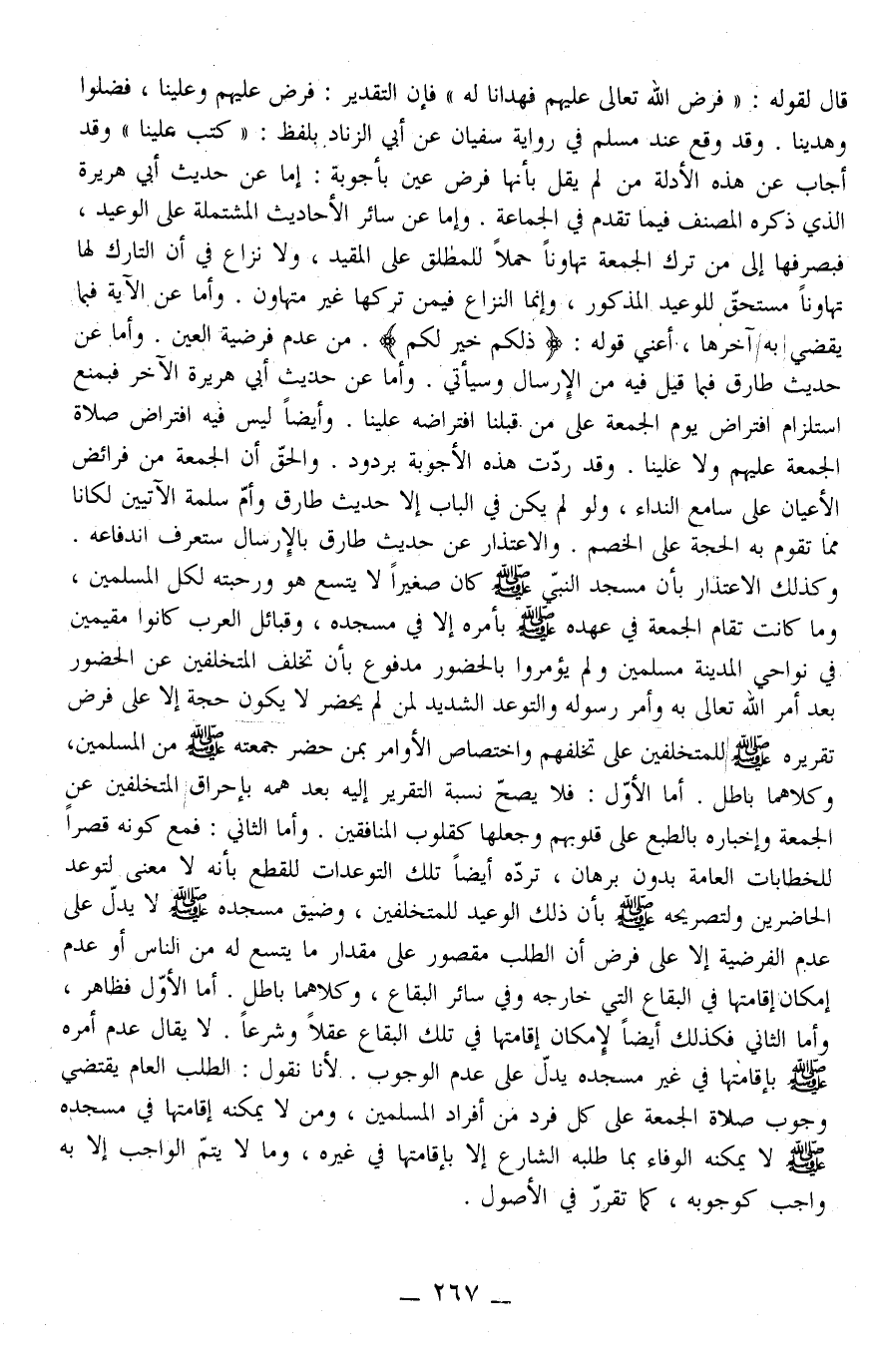وَقَدْ رُدَّتْ هَذِهِ الْأَجْوِبَة بِرُدُودٍ. وَالْحَقّ أَنَّ الْجُمُعَة مِنْ فَرَائِض الْأَعْيَان عَلَى سَامِع النِّدَاءِ، وَلَوْ لَمْ يَكُنْ فِي الْبَابِ إلَّا حَدِيثَ طَارِقٍ وَأُمِّ سَلَمَةَ الْآتِيَيْنِ لَكَانَا مِمَّا تَقُوم بِهِ الْحُجَّة عَلَى الْخَصْم. وَالِاعْتِذَار عَنْ حَدِيثِ طَارِقٍ بِالْإِرْسَالِ سَتَعْرِفُ انْدِفَاعَهُ. وَكَذَلِكَ الِاعْتِذَار بِأَنَّ مَسْجِدَ النَّبِيِّ - صَلَّى اللَّهُ عَلَيْهِ وَسَلَّمَ - كَانَ صَغِيرَا لَا يَتَّسِع هُوَ وَرَحَبَته لِكُلِّ الْمُسْلِمِينَ، وَمَا كَانَتْ تُقَام الْجُمُعَة فِي عَهْده - صَلَّى اللَّهُ عَلَيْهِ وَسَلَّمَ - بِأَمْرِهِ إلَّا فِي مَسْجِده، وَقَبَائِل الْعَرَبِ كَانُوا مُقِيمِينَ فِي نَوَاحِي الْمَدِينَة مُسْلِمِينَ وَلَمْ يُؤْمَرُوا بِالْحُضُورِ مَدْفُوع بِأَنَّ تَخَلُّف الْمُتَخَلِّفِينَ عَنْ الْحُضُور بَعَدَ أَمْر اللَّه تَعَالَى بِهِ وَأَمْر رَسُوله وَالتَّوَعُّد الشَّدِيد لِمَنْ لَمْ يَحْضُر لَا يَكُون حُجَّة إلَّا عَلَى فَرْض تَقْرِيره - صَلَّى اللَّهُ عَلَيْهِ وَسَلَّمَ - لِلْمُتَخَلِّفِينَ عَلَى تَخَلُّفهمْ وَاخْتِصَاص الْأَوَامِر بِمَنْ حَضَرَ جُمُعَته - صَلَّى اللَّهُ عَلَيْهِ وَسَلَّمَ - مِنْ الْمُسْلِمِينَ، وَكِلَاهُمَا بَاطِل.
