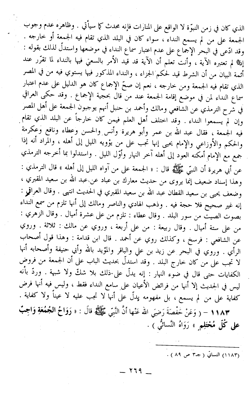 1183 - (وَعَنْ حَفْصَةَ - رَضِيَ اللَّهُ عَنْهَا - أَنَّ النَّبِيَّ - صَلَّى اللَّهُ عَلَيْهِ وَسَلَّمَ - قَالَ: «رَوَاحُ الْجُمُعَةِ وَاجِبٌ عَلَى كُلِّ مُحْتَلِمٍ» رَوَاهُ النَّسَائِيّ) .